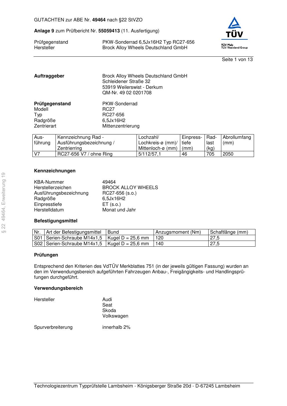 Dieses Gutachten (abe) bezieht sich auf die Alufelge Brock RC27-656 in der Ausführung 6.5Jx16 ET 0, Mittenloch 0 mm (KBA 49464). Im PDF findest du typischerweise zulässige Reifengrößen, Auflagen/Anbauhinweise und – je nach Dokument – Hinweise zur Eintragung.