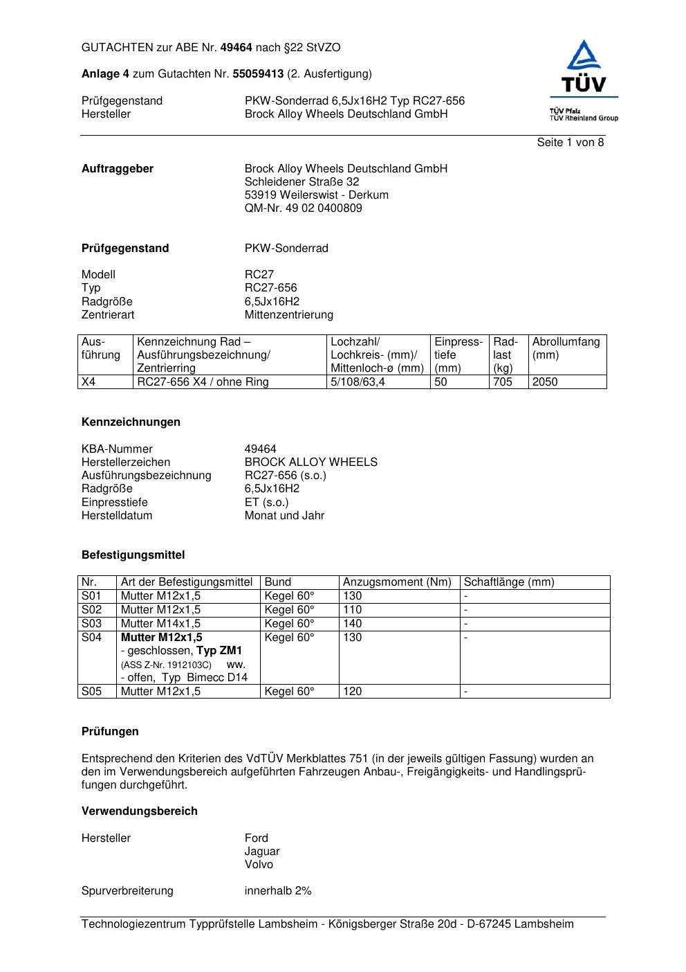 Dieses Gutachten (abe) bezieht sich auf die Alufelge Brock RC27-656 in der Ausführung 6.5Jx16 ET 0, Mittenloch 0 mm (KBA 49464). Im PDF findest du typischerweise zulässige Reifengrößen, Auflagen/Anbauhinweise und – je nach Dokument – Hinweise zur Eintragung.