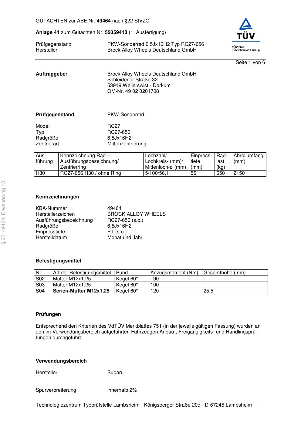 Dieses Gutachten (abe) bezieht sich auf die Alufelge Brock RC27-656 in der Ausführung 6.5Jx16 ET 0, Mittenloch 0 mm (KBA 49464). Im PDF findest du typischerweise zulässige Reifengrößen, Auflagen/Anbauhinweise und – je nach Dokument – Hinweise zur Eintragung.