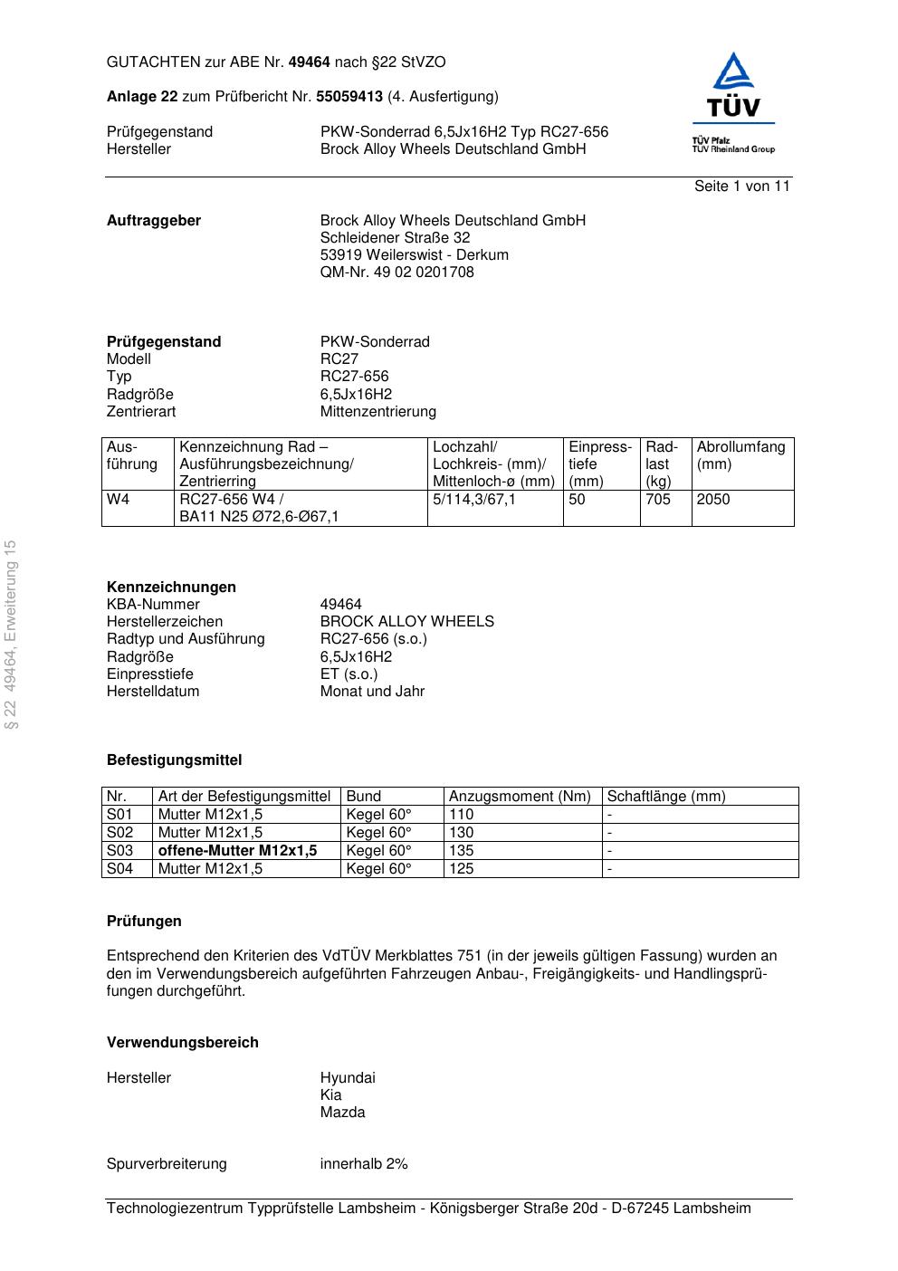 Felgengutachten / abe für Alufelgen Brock RC27-656 (6.5Jx16 ET 0, Mittenloch 0 mm) mit KBA 49464 (Zertifikatsnummer 49464). Hier kostenlos als PDF herunterladen. Der Download-Link ist 24 Stunden gültig und kann bis zu zwei Mal verwendet werden.