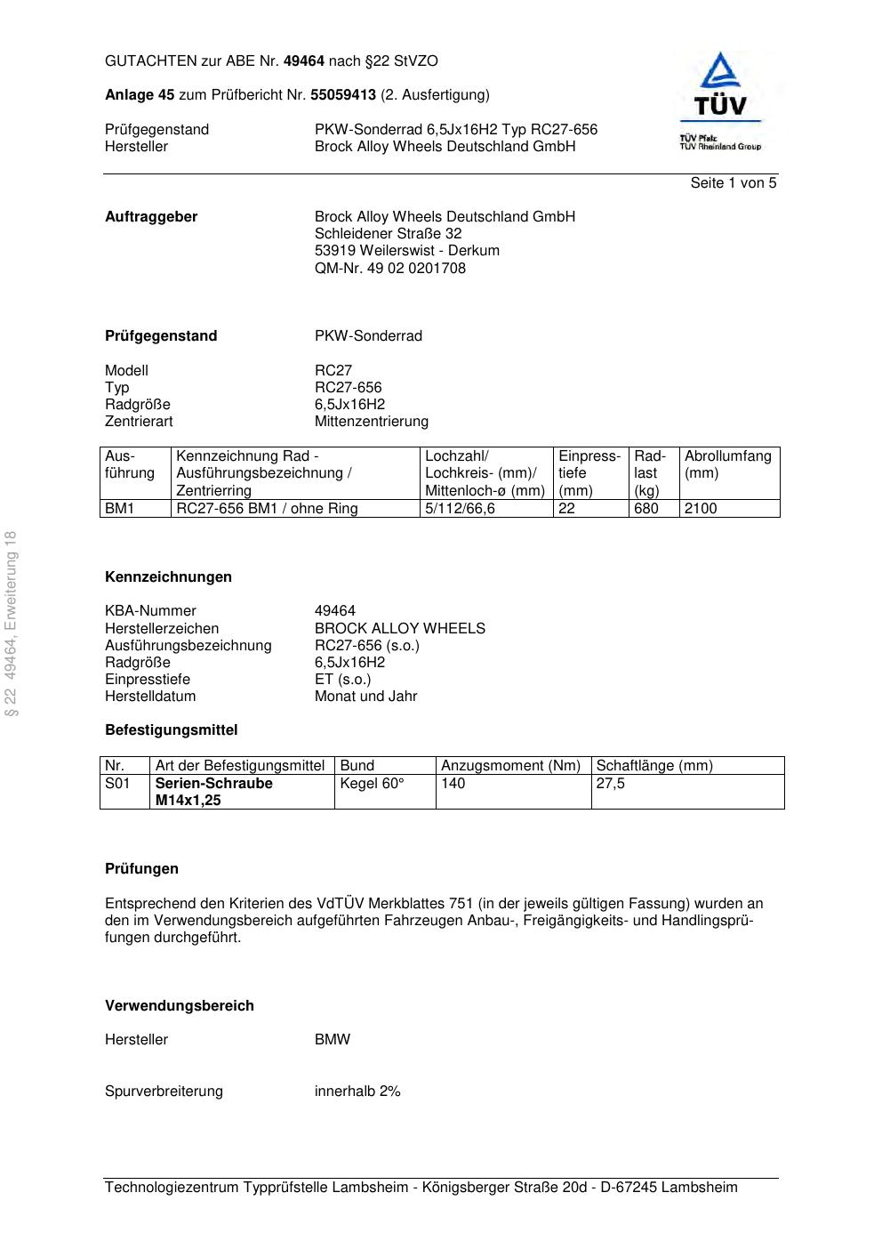 Dieses Gutachten (abe) bezieht sich auf die Alufelge Brock RC27-656 in der Ausführung 6.5Jx16 ET 0, Mittenloch 0 mm (KBA 49464). Im PDF findest du typischerweise zulässige Reifengrößen, Auflagen/Anbauhinweise und – je nach Dokument – Hinweise zur Eintragung.