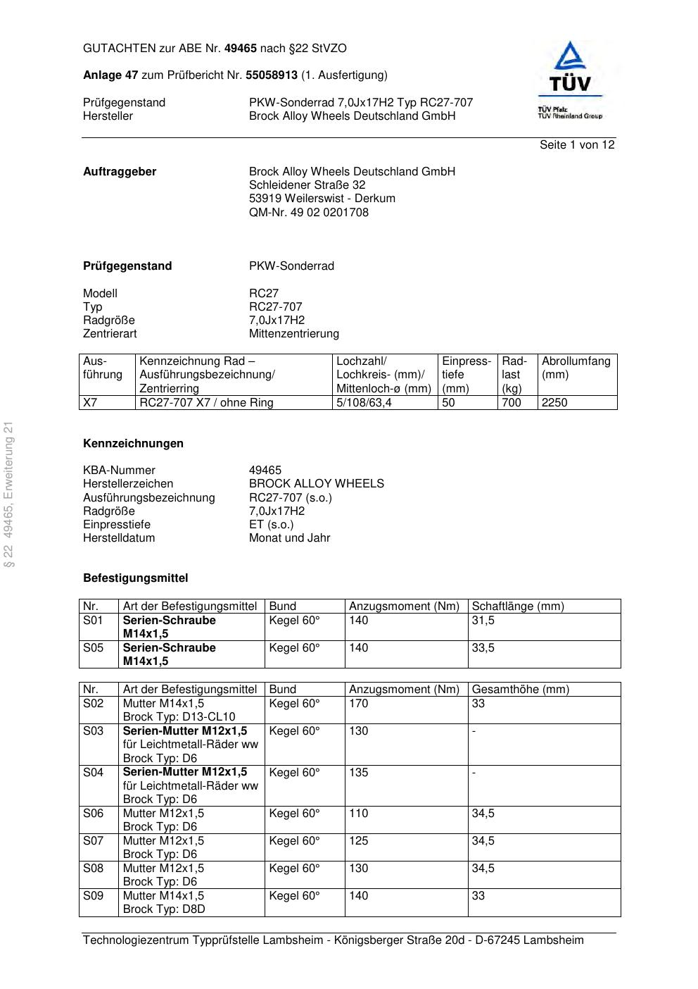 Dieses Gutachten (abe) bezieht sich auf die Alufelge Brock RC27-707 in der Ausführung 7Jx17 ET 0, Mittenloch 0 mm (KBA 49465). Im PDF findest du typischerweise zulässige Reifengrößen, Auflagen/Anbauhinweise und – je nach Dokument – Hinweise zur Eintragung.