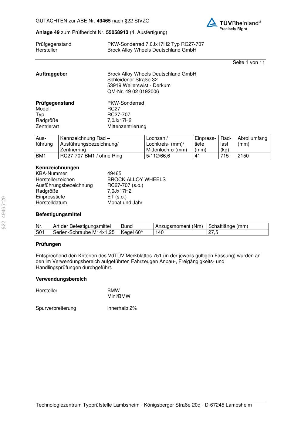Dieses Gutachten (abe) bezieht sich auf die Alufelge Brock RC27-707 in der Ausführung 7Jx17 ET 0, Mittenloch 0 mm (KBA 49465). Im PDF findest du typischerweise zulässige Reifengrößen, Auflagen/Anbauhinweise und – je nach Dokument – Hinweise zur Eintragung.