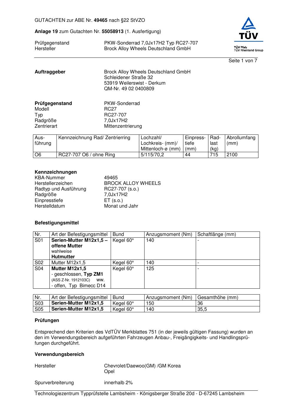 Dieses Gutachten (abe) bezieht sich auf die Alufelge Brock RC27-707 in der Ausführung 7Jx17 ET 0, Mittenloch 0 mm (KBA 49465). Im PDF findest du typischerweise zulässige Reifengrößen, Auflagen/Anbauhinweise und – je nach Dokument – Hinweise zur Eintragung.