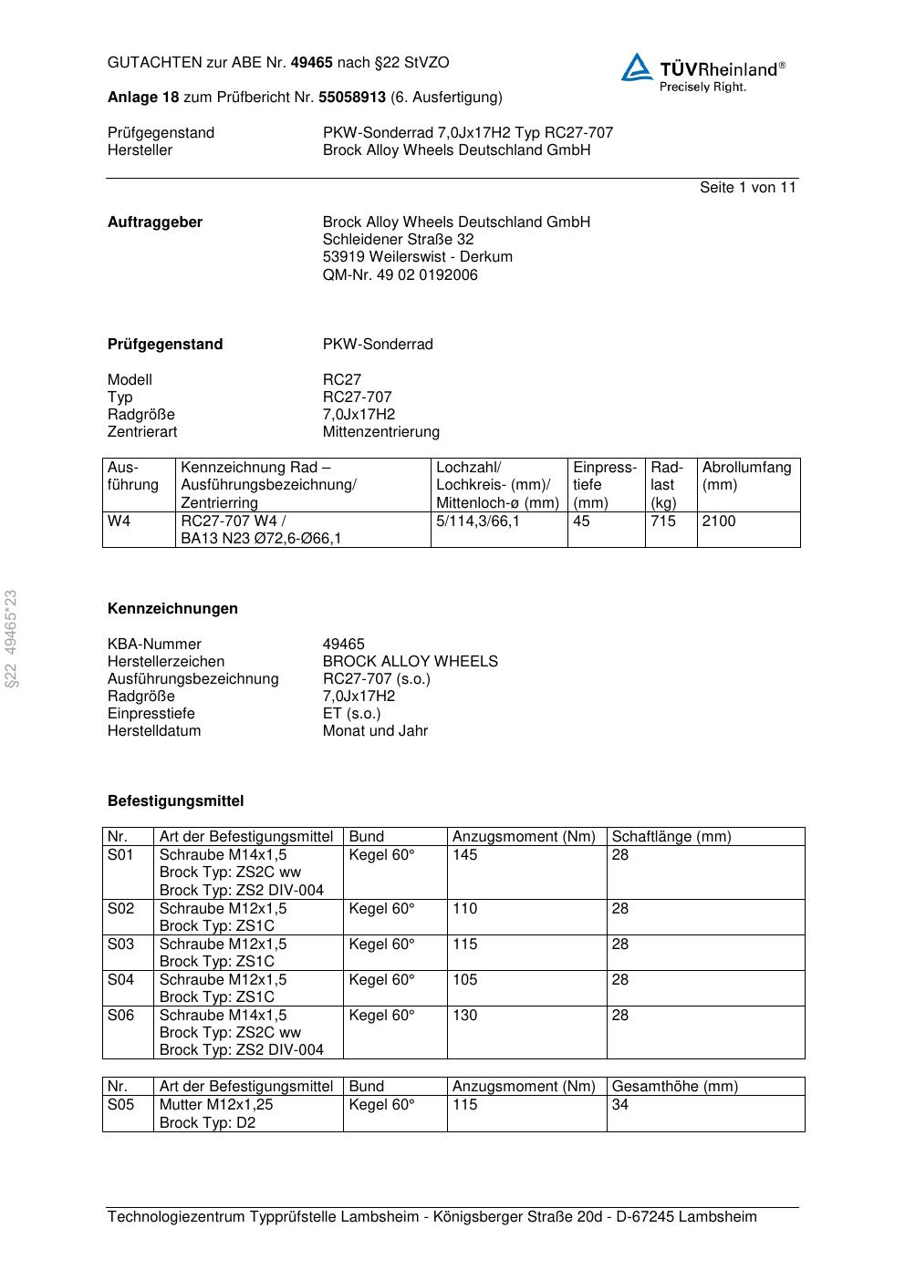 Dieses Gutachten (abe) bezieht sich auf die Alufelge Brock RC27-707 in der Ausführung 7Jx17 ET 0, Mittenloch 0 mm (KBA 49465). Im PDF findest du typischerweise zulässige Reifengrößen, Auflagen/Anbauhinweise und – je nach Dokument – Hinweise zur Eintragung.