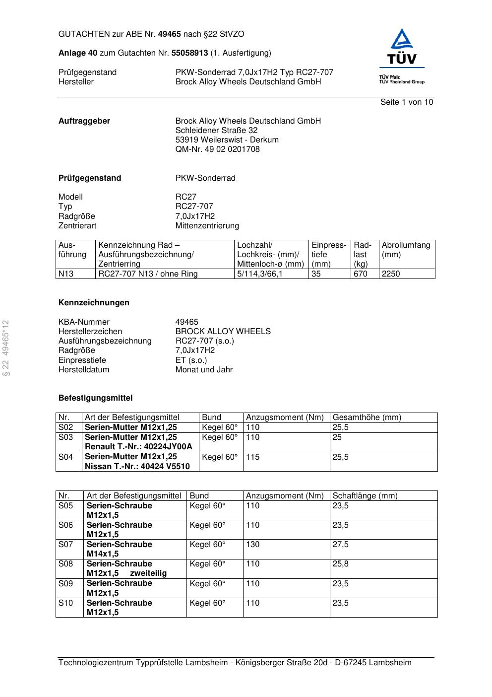 Dieses Gutachten (abe) bezieht sich auf die Alufelge Brock RC27-707 in der Ausführung 7Jx17 ET 0, Mittenloch 0 mm (KBA 49465). Im PDF findest du typischerweise zulässige Reifengrößen, Auflagen/Anbauhinweise und – je nach Dokument – Hinweise zur Eintragung.