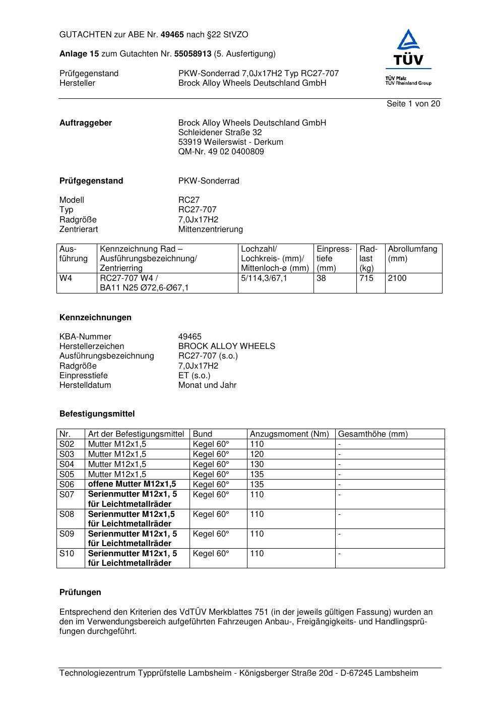 Dieses Gutachten (abe) bezieht sich auf die Alufelge Brock RC27-707 in der Ausführung 7Jx17 ET 0, Mittenloch 0 mm (KBA 49465). Im PDF findest du typischerweise zulässige Reifengrößen, Auflagen/Anbauhinweise und – je nach Dokument – Hinweise zur Eintragung.
