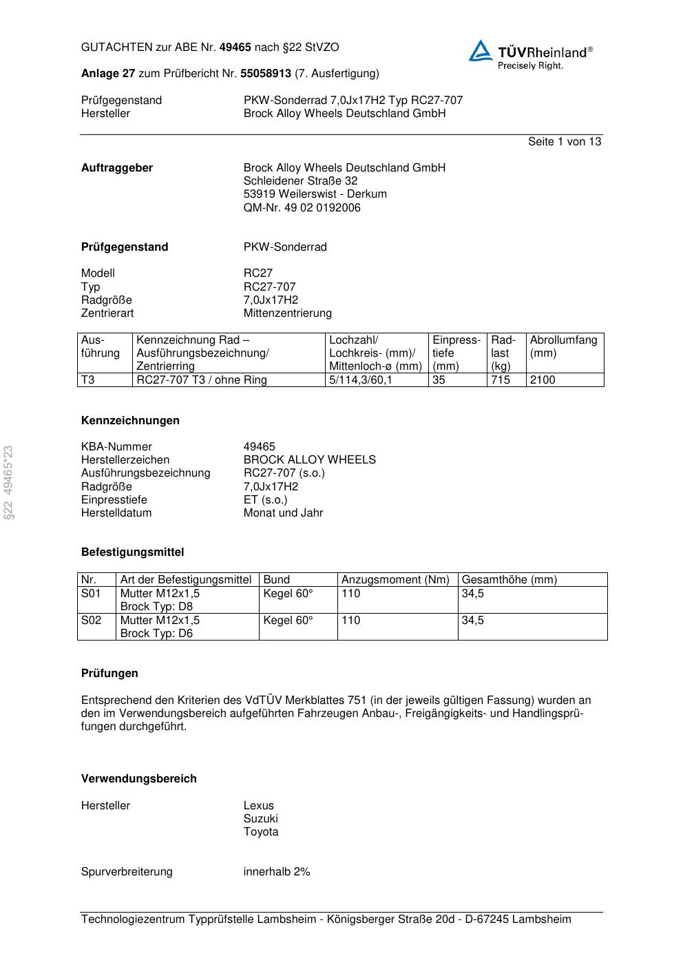Dieses Gutachten (abe) bezieht sich auf die Alufelge Brock RC27-707 in der Ausführung 7Jx17 ET 0, Mittenloch 0 mm (KBA 49465). Im PDF findest du typischerweise zulässige Reifengrößen, Auflagen/Anbauhinweise und – je nach Dokument – Hinweise zur Eintragung.
