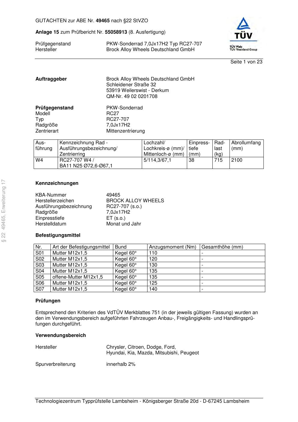 Dieses Gutachten (abe) bezieht sich auf die Alufelge Brock RC27-707 in der Ausführung 7Jx17 ET 0, Mittenloch 0 mm (KBA 49465). Im PDF findest du typischerweise zulässige Reifengrößen, Auflagen/Anbauhinweise und – je nach Dokument – Hinweise zur Eintragung.