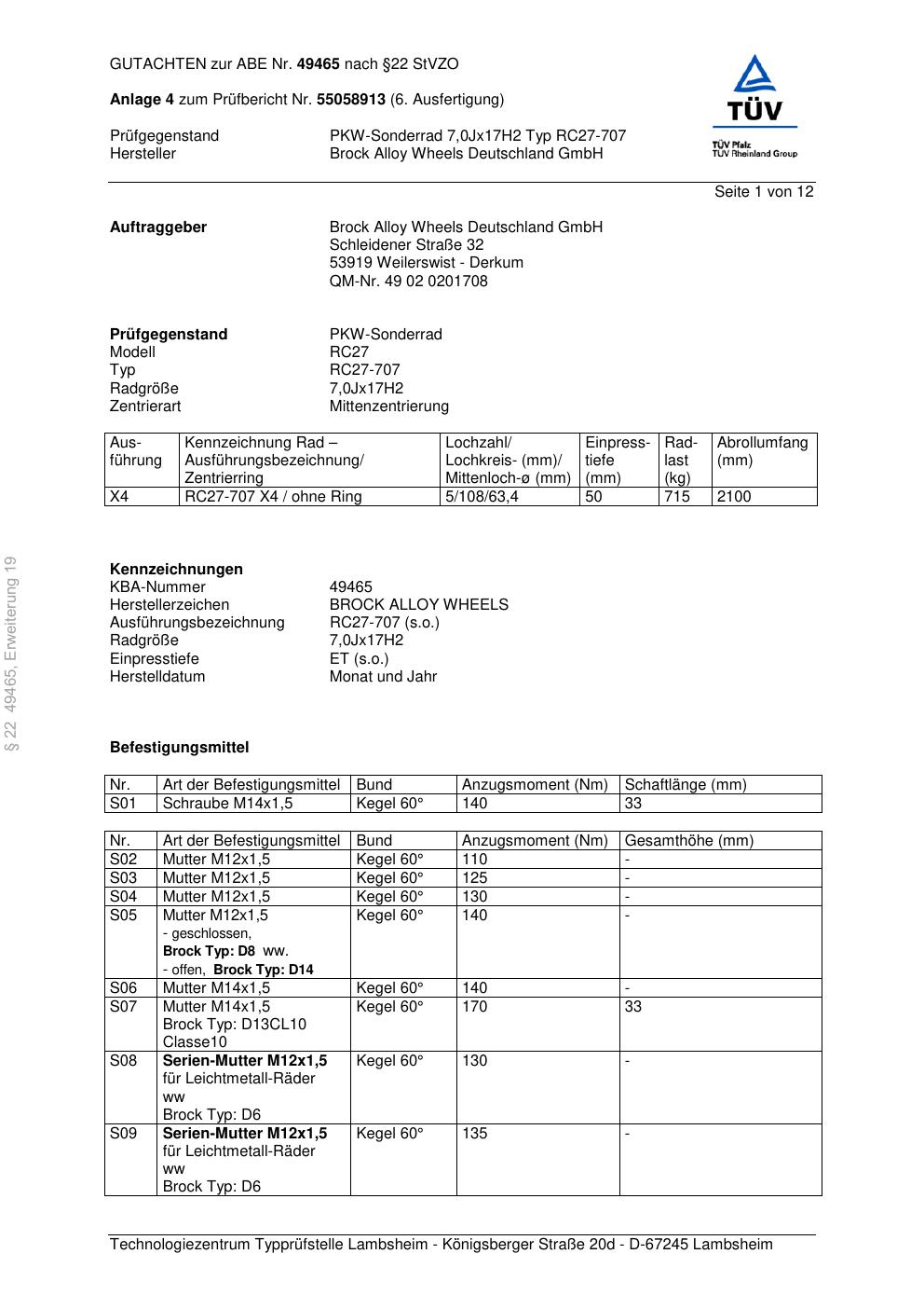 Dieses Gutachten (abe) bezieht sich auf die Alufelge Brock RC27-707 in der Ausführung 7Jx17 ET 0, Mittenloch 0 mm (KBA 49465). Im PDF findest du typischerweise zulässige Reifengrößen, Auflagen/Anbauhinweise und – je nach Dokument – Hinweise zur Eintragung.