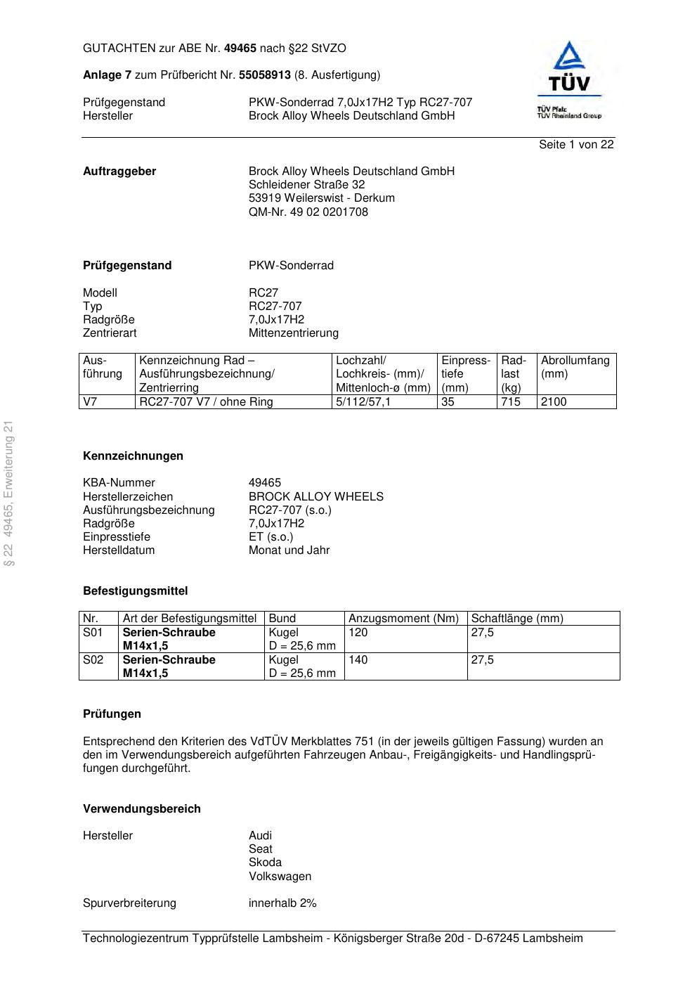 Dieses Gutachten (abe) bezieht sich auf die Alufelge Brock RC27-707 in der Ausführung 7Jx17 ET 0, Mittenloch 0 mm (KBA 49465). Im PDF findest du typischerweise zulässige Reifengrößen, Auflagen/Anbauhinweise und – je nach Dokument – Hinweise zur Eintragung.