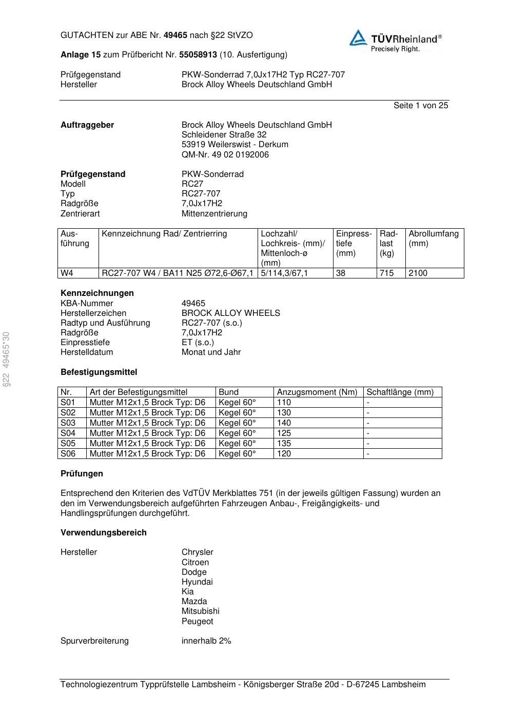 Dieses Gutachten (abe) bezieht sich auf die Alufelge Brock RC27-707 in der Ausführung 7Jx17 ET 0, Mittenloch 0 mm (KBA 49465). Im PDF findest du typischerweise zulässige Reifengrößen, Auflagen/Anbauhinweise und – je nach Dokument – Hinweise zur Eintragung.