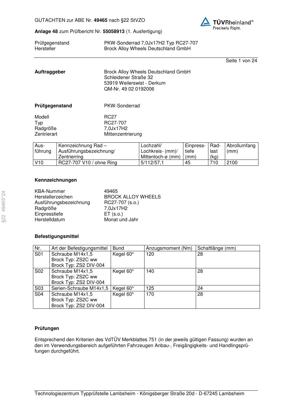 Dieses Gutachten (abe) bezieht sich auf die Alufelge Brock RC27-707 in der Ausführung 7Jx17 ET 0, Mittenloch 0 mm (KBA 49465). Im PDF findest du typischerweise zulässige Reifengrößen, Auflagen/Anbauhinweise und – je nach Dokument – Hinweise zur Eintragung.