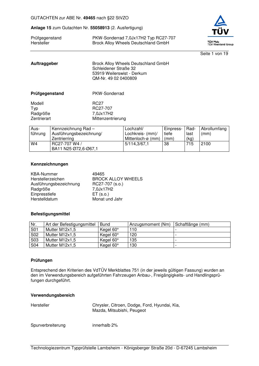 Dieses Gutachten (abe) bezieht sich auf die Alufelge Brock RC27-707 in der Ausführung 7Jx17 ET 0, Mittenloch 0 mm (KBA 49465). Im PDF findest du typischerweise zulässige Reifengrößen, Auflagen/Anbauhinweise und – je nach Dokument – Hinweise zur Eintragung.