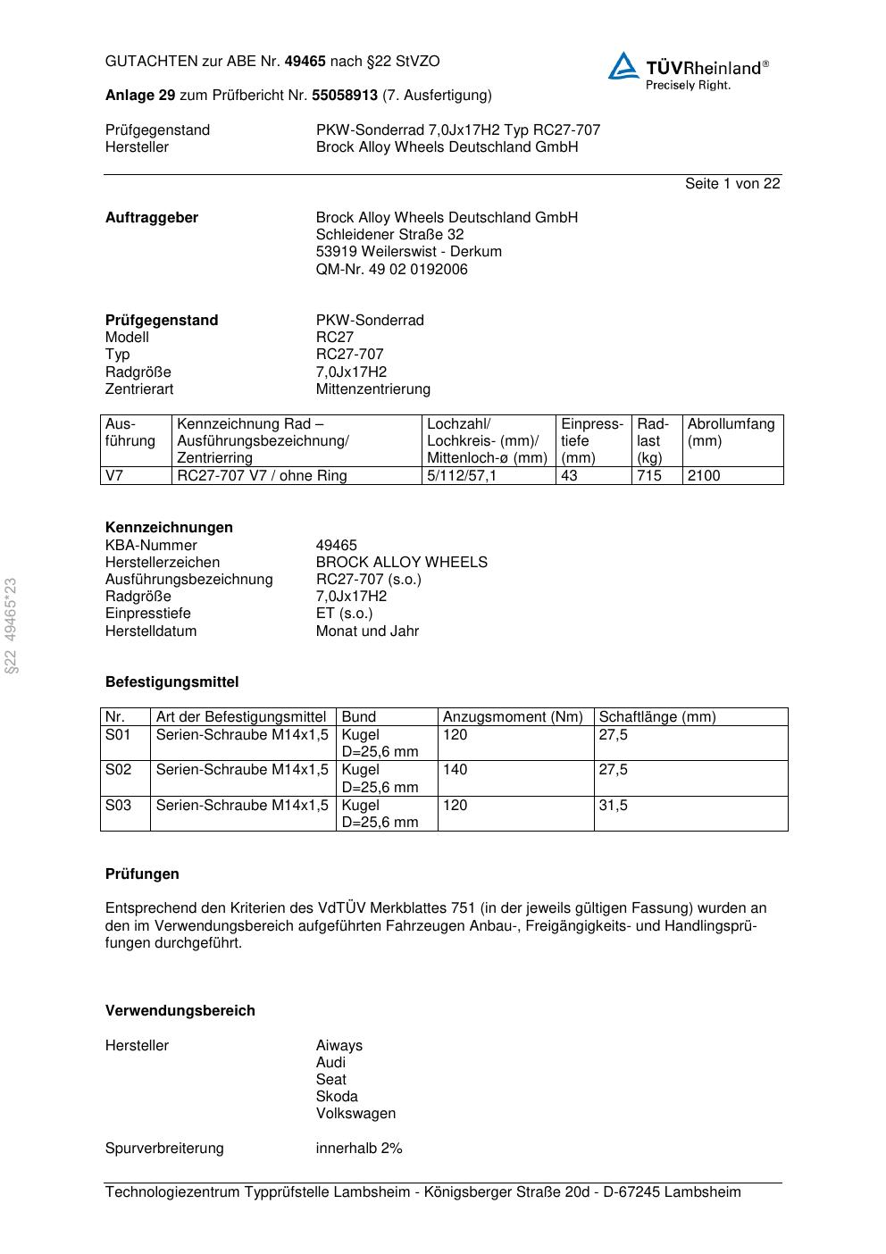 Dieses Gutachten (abe) bezieht sich auf die Alufelge Brock RC27-707 in der Ausführung 7Jx17 ET 0, Mittenloch 0 mm (KBA 49465). Im PDF findest du typischerweise zulässige Reifengrößen, Auflagen/Anbauhinweise und – je nach Dokument – Hinweise zur Eintragung.