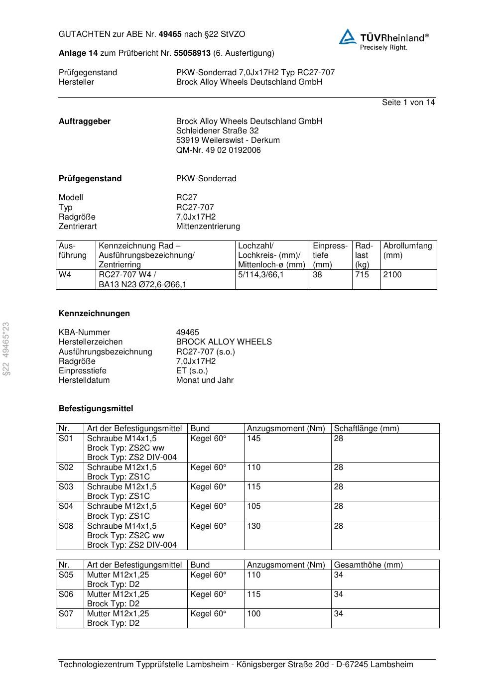 Dieses Gutachten (abe) bezieht sich auf die Alufelge Brock RC27-707 in der Ausführung 7Jx17 ET 0, Mittenloch 0 mm (KBA 49465). Im PDF findest du typischerweise zulässige Reifengrößen, Auflagen/Anbauhinweise und – je nach Dokument – Hinweise zur Eintragung.