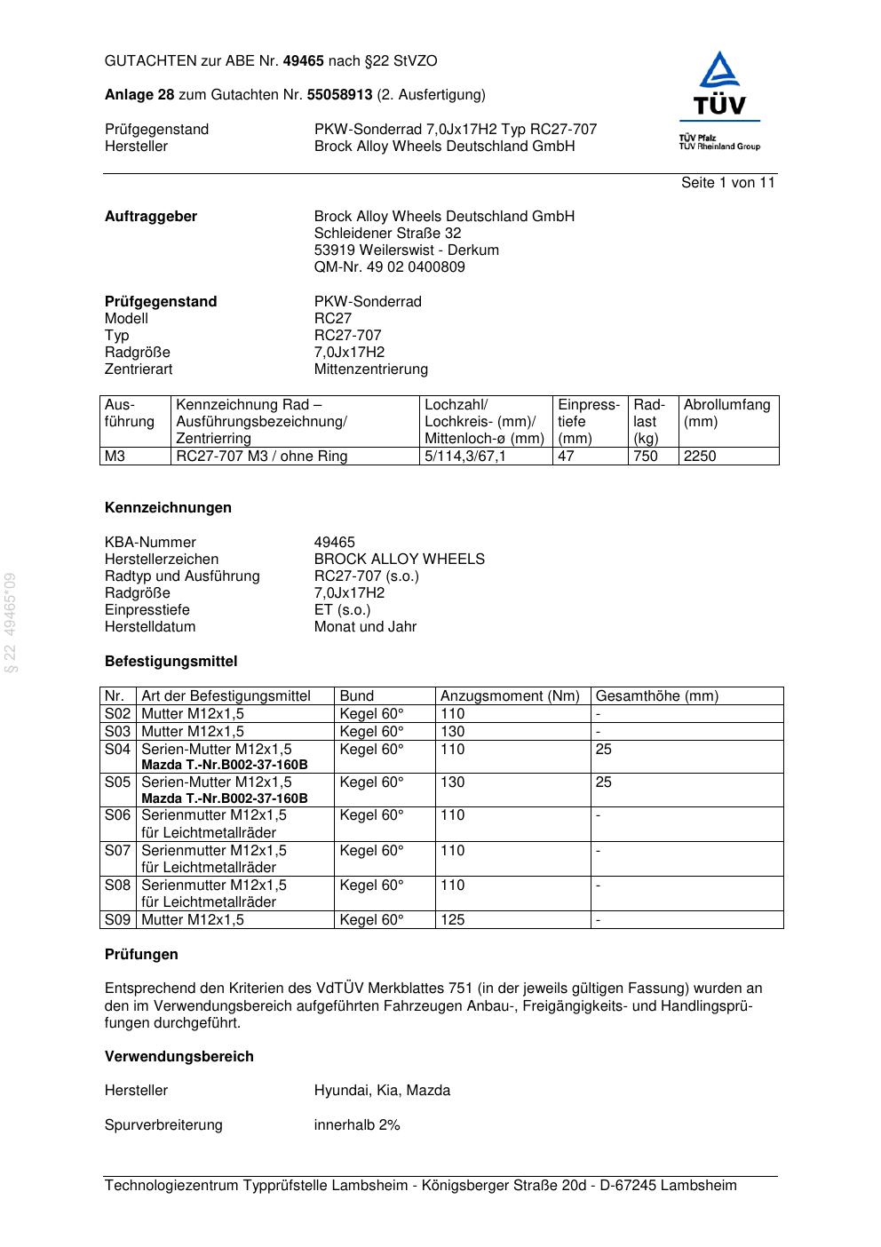 Dieses Gutachten (abe) bezieht sich auf die Alufelge Brock RC27-707 in der Ausführung 7Jx17 ET 0, Mittenloch 0 mm (KBA 49465). Im PDF findest du typischerweise zulässige Reifengrößen, Auflagen/Anbauhinweise und – je nach Dokument – Hinweise zur Eintragung.