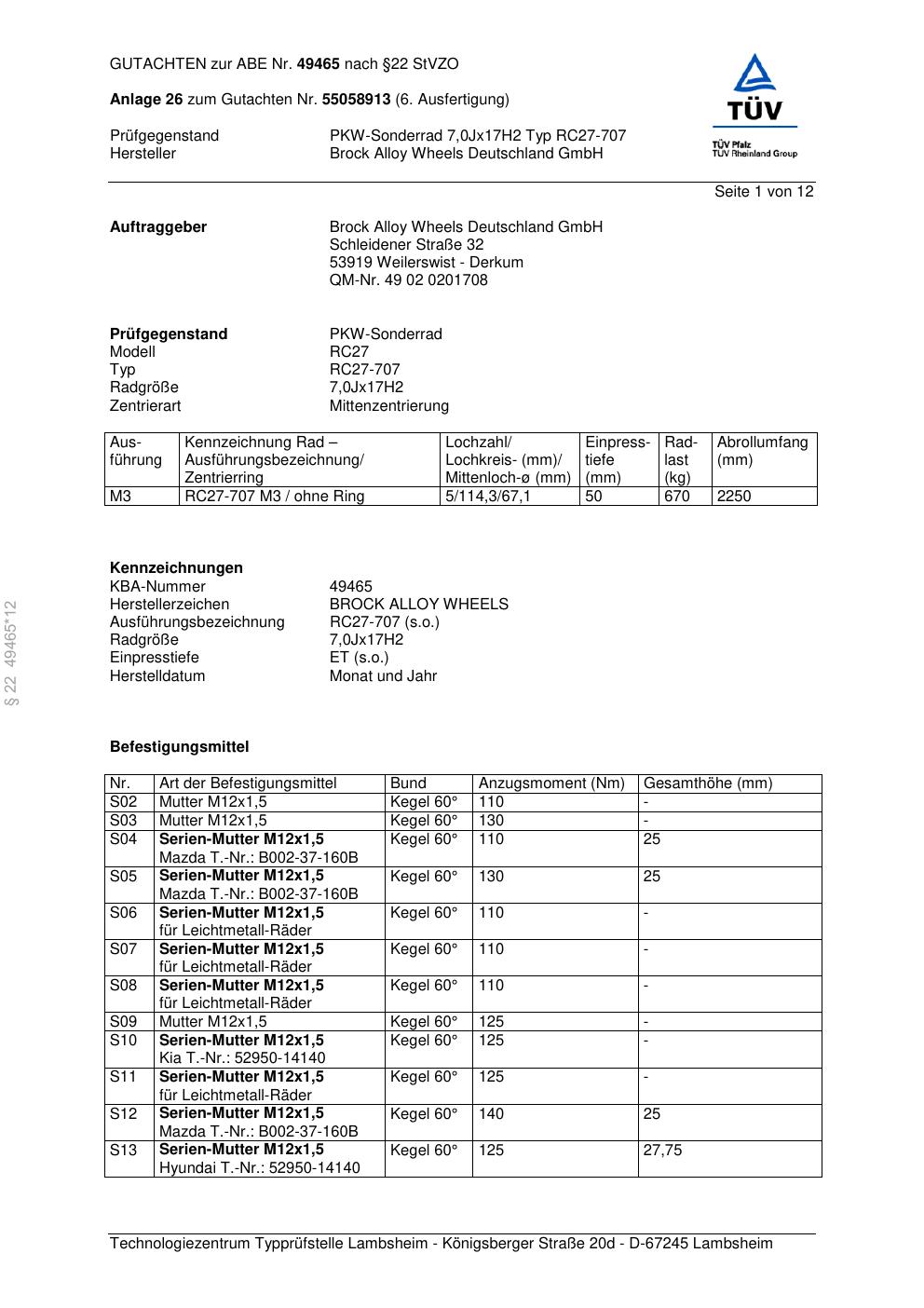 Dieses Gutachten (abe) bezieht sich auf die Alufelge Brock RC27-707 in der Ausführung 7Jx17 ET 0, Mittenloch 0 mm (KBA 49465). Im PDF findest du typischerweise zulässige Reifengrößen, Auflagen/Anbauhinweise und – je nach Dokument – Hinweise zur Eintragung.