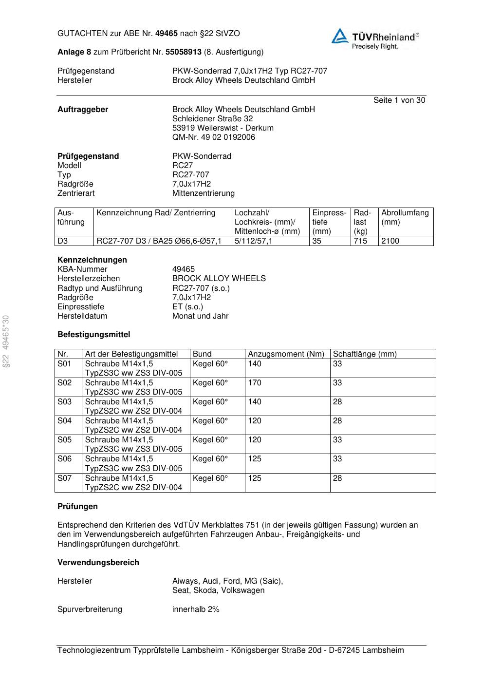 Dieses Gutachten (abe) bezieht sich auf die Alufelge Brock RC27-707 in der Ausführung 7Jx17 ET 0, Mittenloch 0 mm (KBA 49465). Im PDF findest du typischerweise zulässige Reifengrößen, Auflagen/Anbauhinweise und – je nach Dokument – Hinweise zur Eintragung.