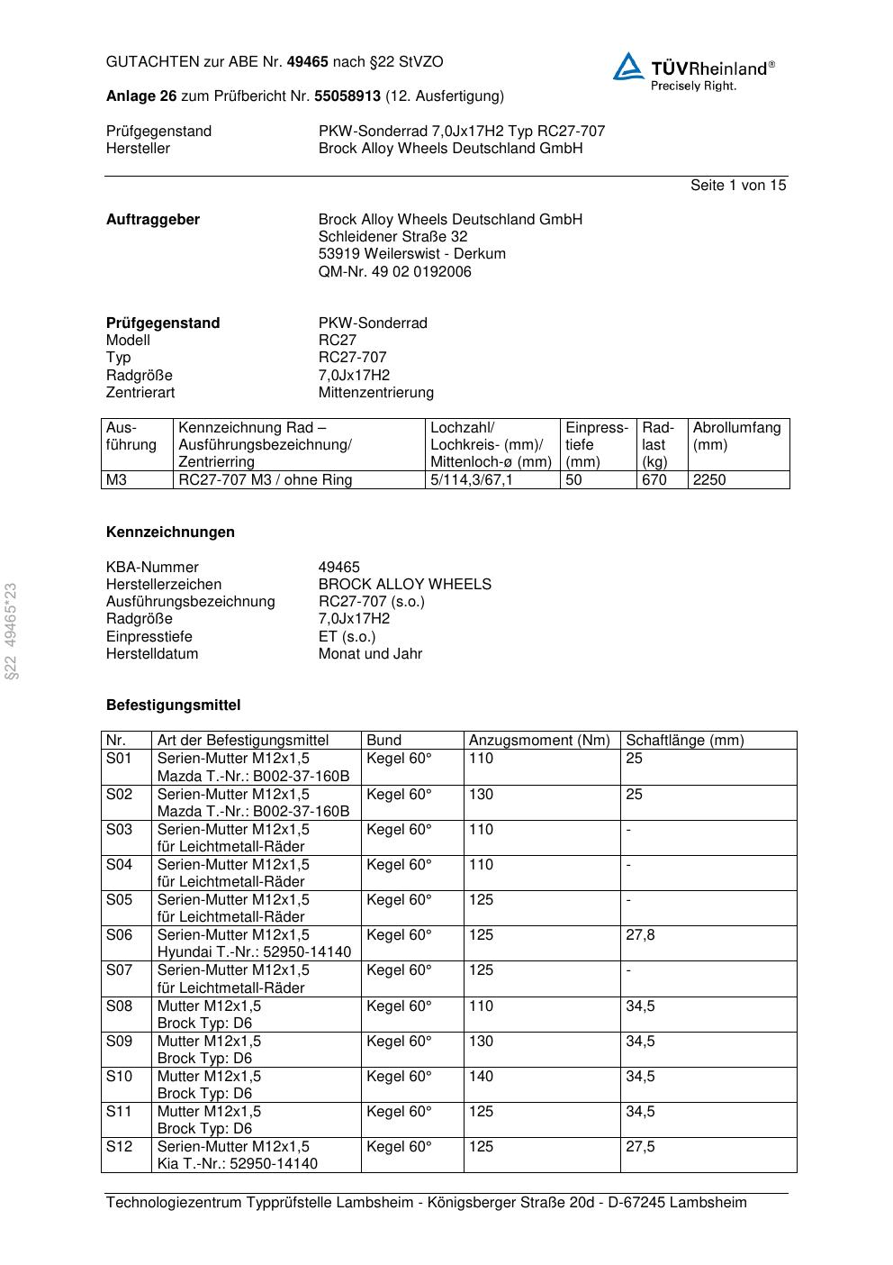 Dieses Gutachten (abe) bezieht sich auf die Alufelge Brock RC27-707 in der Ausführung 7Jx17 ET 0, Mittenloch 0 mm (KBA 49465). Im PDF findest du typischerweise zulässige Reifengrößen, Auflagen/Anbauhinweise und – je nach Dokument – Hinweise zur Eintragung.