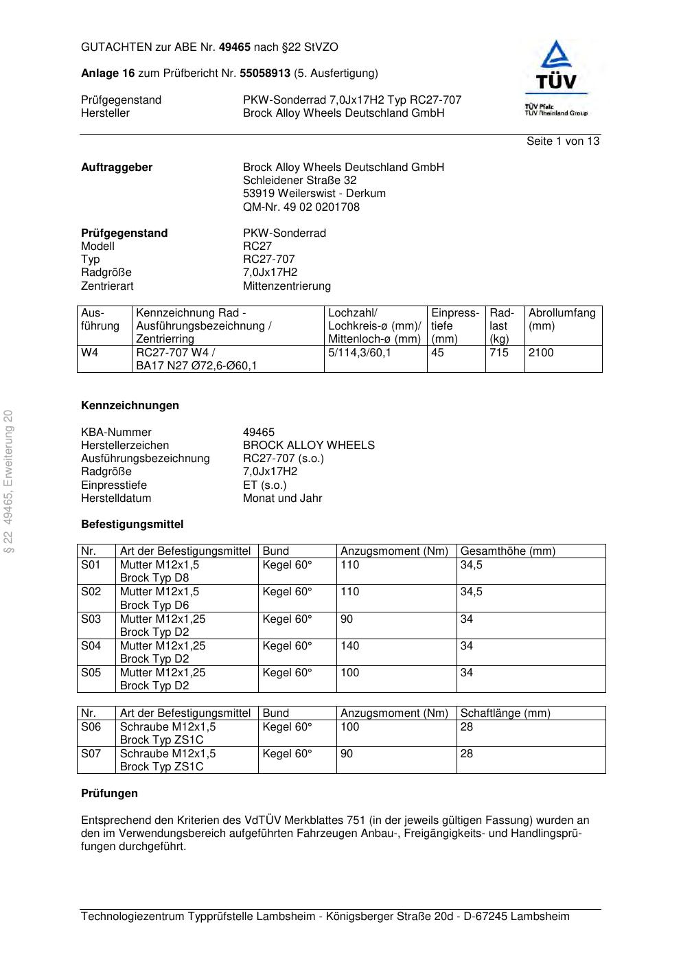 Dieses Gutachten (abe) bezieht sich auf die Alufelge Brock RC27-707 in der Ausführung 7Jx17 ET 0, Mittenloch 0 mm (KBA 49465). Im PDF findest du typischerweise zulässige Reifengrößen, Auflagen/Anbauhinweise und – je nach Dokument – Hinweise zur Eintragung.