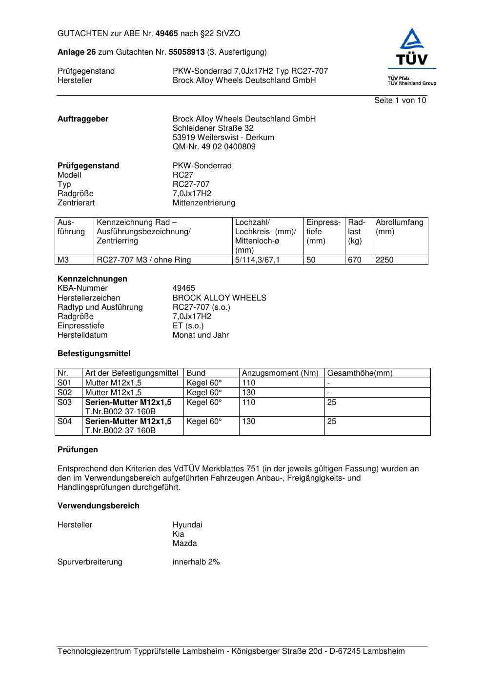 Dieses Gutachten (abe) bezieht sich auf die Alufelge Brock RC27-707 in der Ausführung 7Jx17 ET 0, Mittenloch 0 mm (KBA 49465). Im PDF findest du typischerweise zulässige Reifengrößen, Auflagen/Anbauhinweise und – je nach Dokument – Hinweise zur Eintragung.