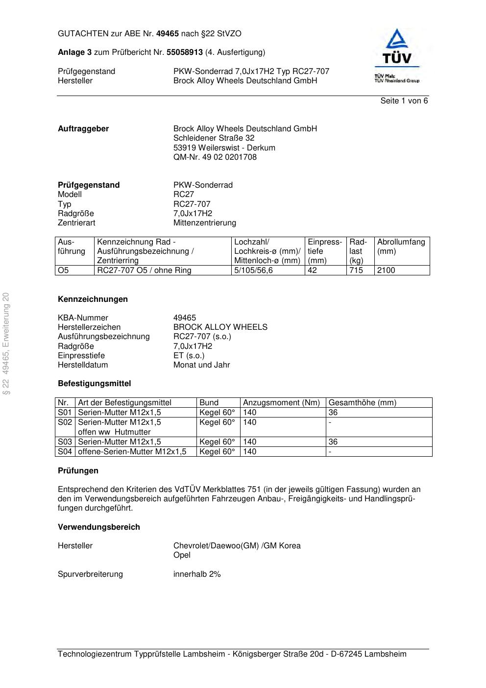 Dieses Gutachten (abe) bezieht sich auf die Alufelge Brock RC27-707 in der Ausführung 7Jx17 ET 0, Mittenloch 0 mm (KBA 49465). Im PDF findest du typischerweise zulässige Reifengrößen, Auflagen/Anbauhinweise und – je nach Dokument – Hinweise zur Eintragung.