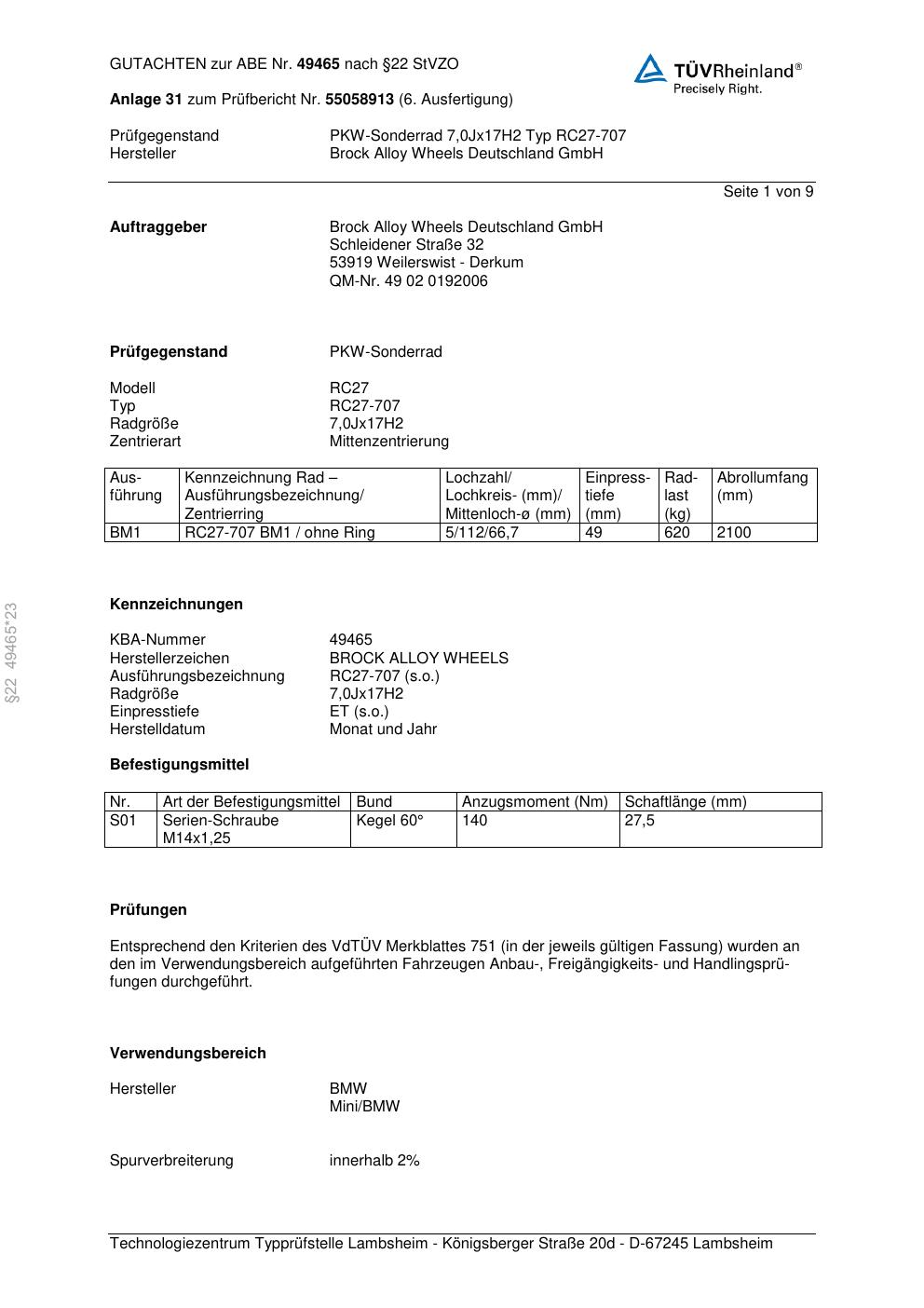 Dieses Gutachten (abe) bezieht sich auf die Alufelge Brock RC27-707 in der Ausführung 7Jx17 ET 0, Mittenloch 0 mm (KBA 49465). Im PDF findest du typischerweise zulässige Reifengrößen, Auflagen/Anbauhinweise und – je nach Dokument – Hinweise zur Eintragung.