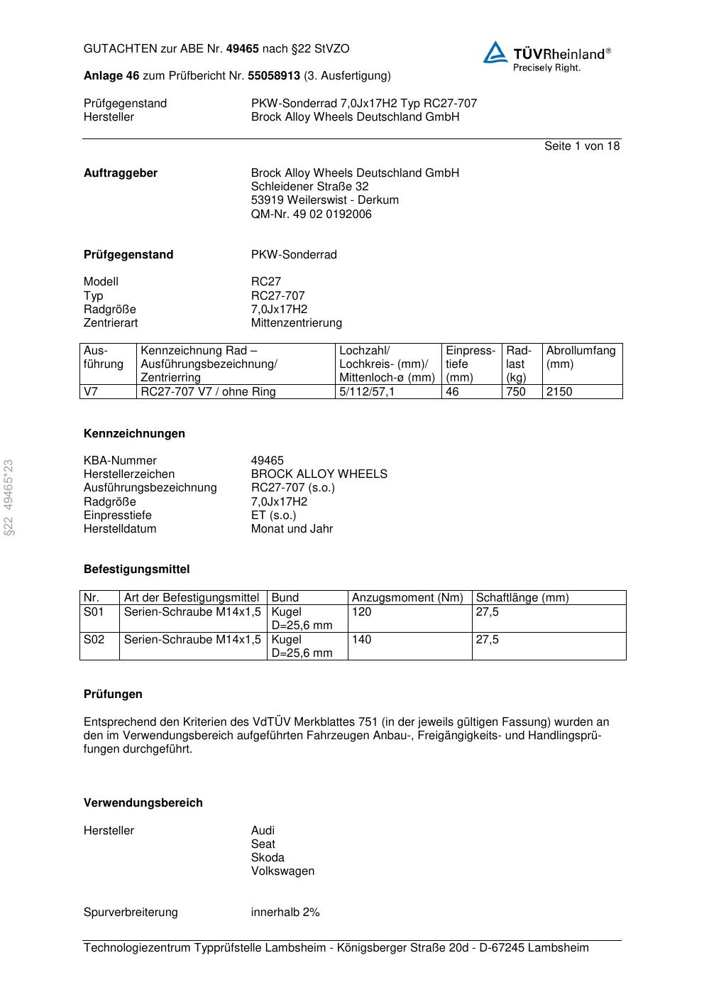 Dieses Gutachten (abe) bezieht sich auf die Alufelge Brock RC27-707 in der Ausführung 7Jx17 ET 0, Mittenloch 0 mm (KBA 49465). Im PDF findest du typischerweise zulässige Reifengrößen, Auflagen/Anbauhinweise und – je nach Dokument – Hinweise zur Eintragung.