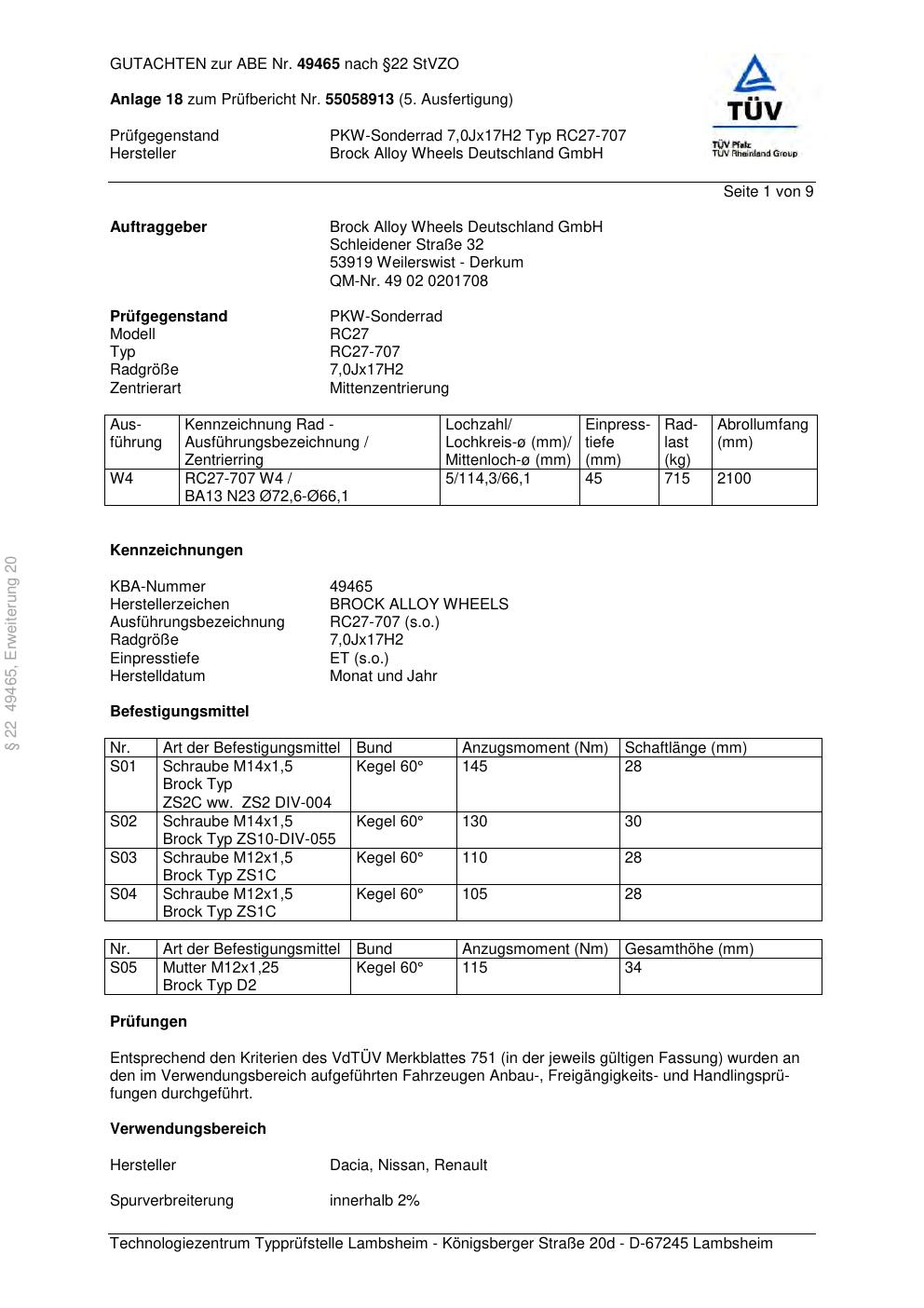 Dieses Gutachten (abe) bezieht sich auf die Alufelge Brock RC27-707 in der Ausführung 7Jx17 ET 0, Mittenloch 0 mm (KBA 49465). Im PDF findest du typischerweise zulässige Reifengrößen, Auflagen/Anbauhinweise und – je nach Dokument – Hinweise zur Eintragung.