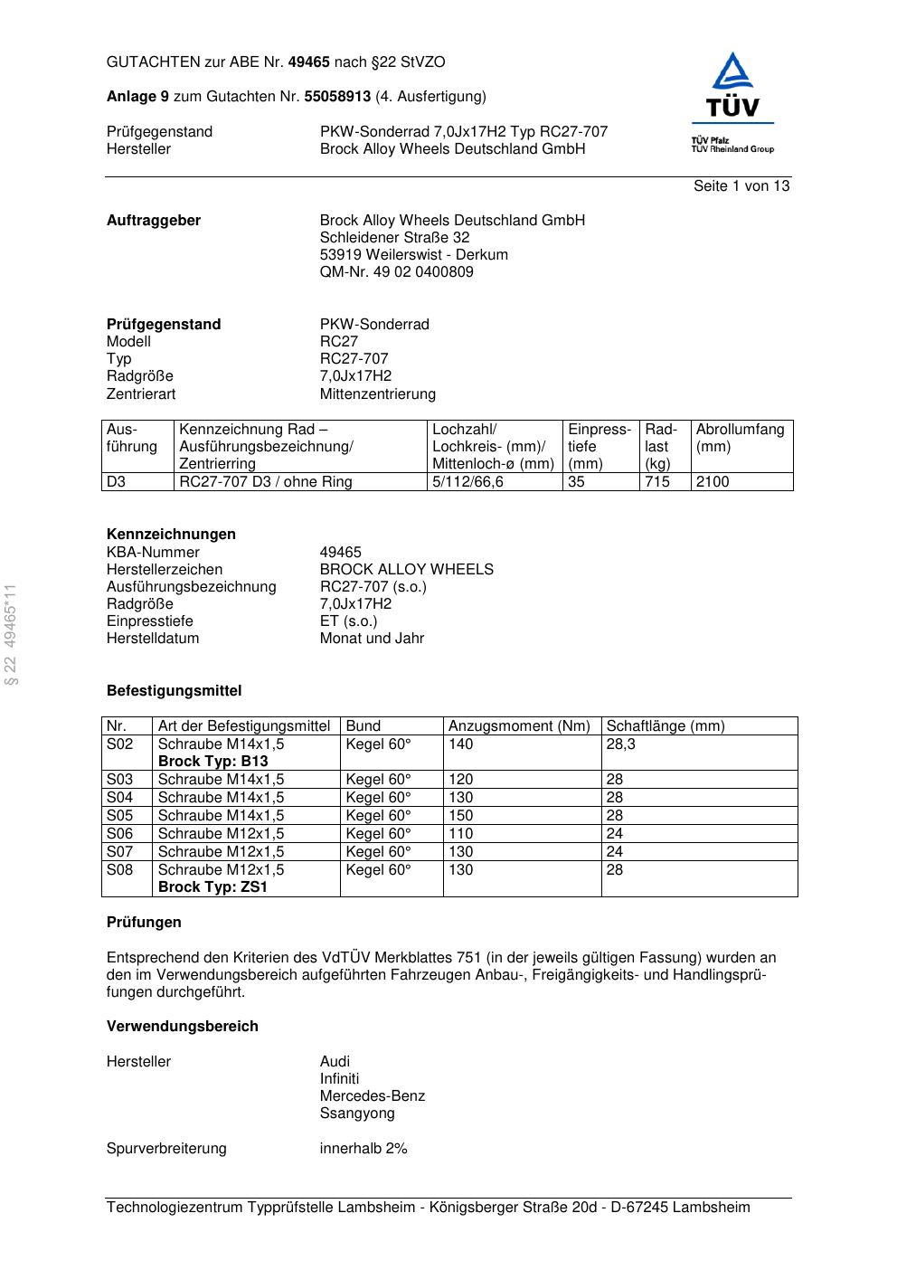 Dieses Gutachten (abe) bezieht sich auf die Alufelge Brock RC27-707 in der Ausführung 7Jx17 ET 0, Mittenloch 0 mm (KBA 49465). Im PDF findest du typischerweise zulässige Reifengrößen, Auflagen/Anbauhinweise und – je nach Dokument – Hinweise zur Eintragung.