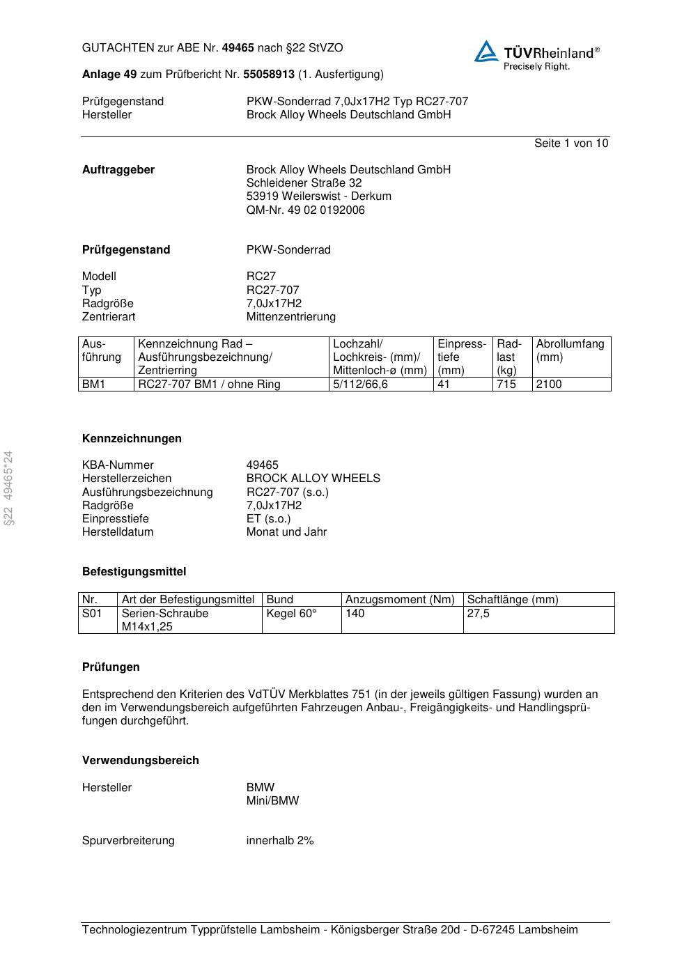 Dieses Gutachten (abe) bezieht sich auf die Alufelge Brock RC27-707 in der Ausführung 7Jx17 ET 0, Mittenloch 0 mm (KBA 49465). Im PDF findest du typischerweise zulässige Reifengrößen, Auflagen/Anbauhinweise und – je nach Dokument – Hinweise zur Eintragung.