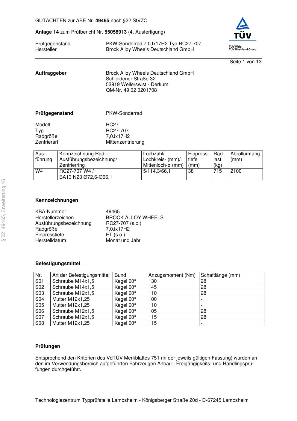 Dieses Gutachten (abe) bezieht sich auf die Alufelge Brock RC27-707 in der Ausführung 7Jx17 ET 0, Mittenloch 0 mm (KBA 49465). Im PDF findest du typischerweise zulässige Reifengrößen, Auflagen/Anbauhinweise und – je nach Dokument – Hinweise zur Eintragung.
