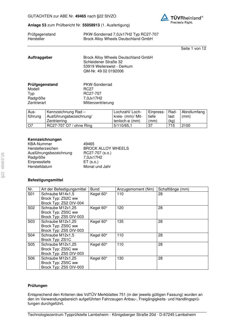 Dieses Gutachten (abe) bezieht sich auf die Alufelge Brock RC27-707 in der Ausführung 7Jx17 ET 0, Mittenloch 0 mm (KBA 49465). Im PDF findest du typischerweise zulässige Reifengrößen, Auflagen/Anbauhinweise und – je nach Dokument – Hinweise zur Eintragung.