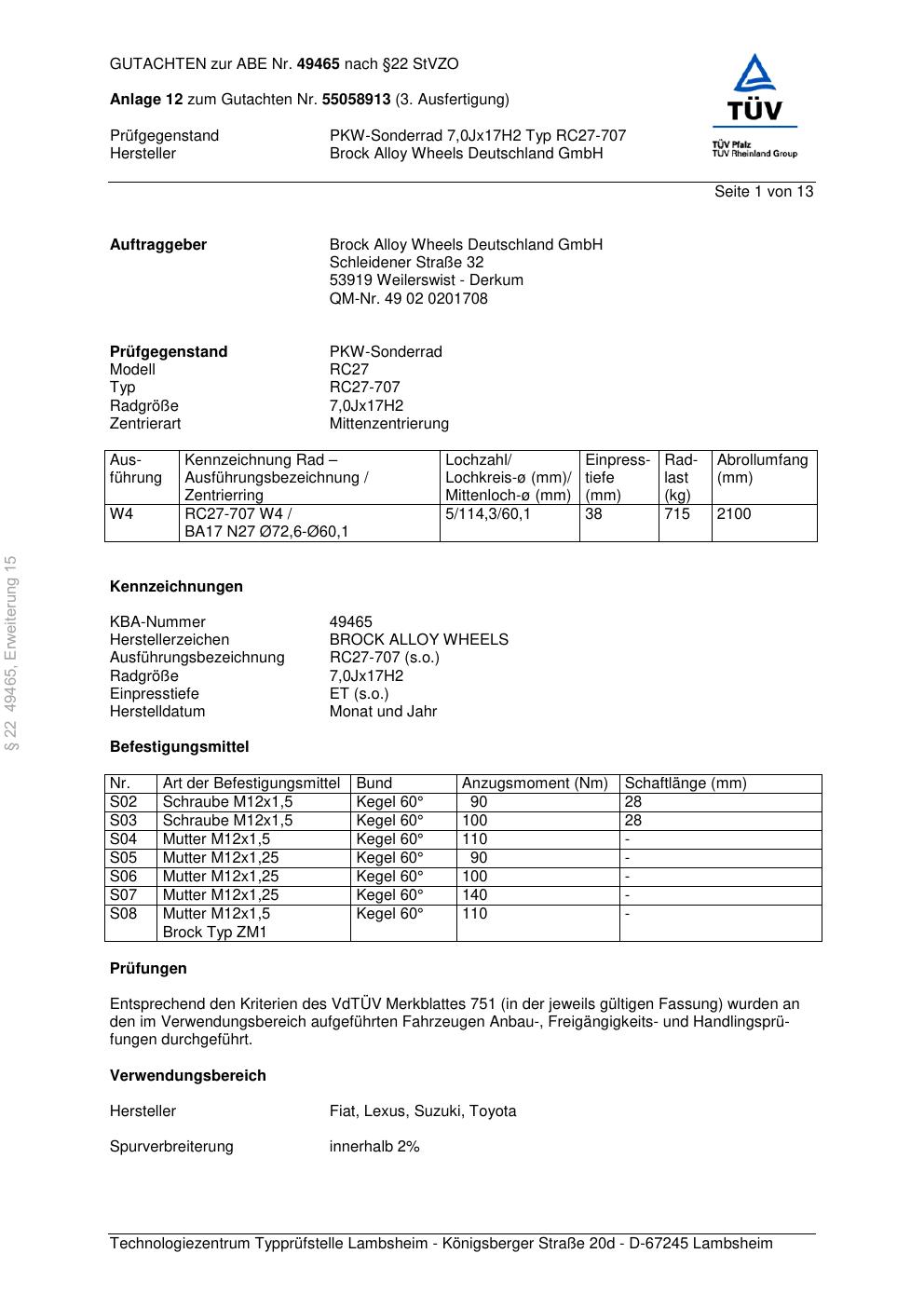 Dieses Gutachten (abe) bezieht sich auf die Alufelge Brock RC27-707 in der Ausführung 7Jx17 ET 0, Mittenloch 0 mm (KBA 49465). Im PDF findest du typischerweise zulässige Reifengrößen, Auflagen/Anbauhinweise und – je nach Dokument – Hinweise zur Eintragung.