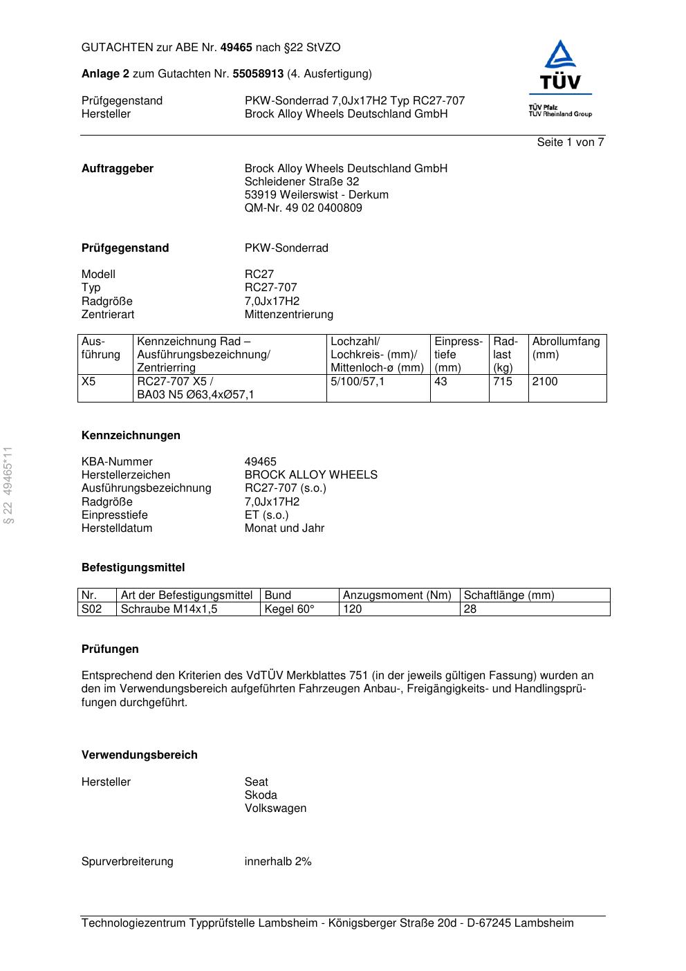 Dieses Gutachten (abe) bezieht sich auf die Alufelge Brock RC27-707 in der Ausführung 7Jx17 ET 0, Mittenloch 0 mm (KBA 49465). Im PDF findest du typischerweise zulässige Reifengrößen, Auflagen/Anbauhinweise und – je nach Dokument – Hinweise zur Eintragung.
