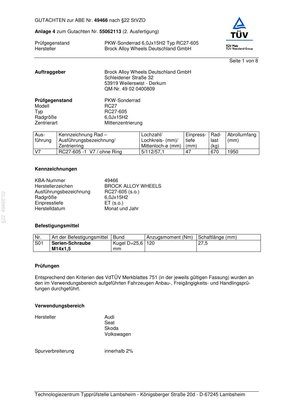 Felgengutachten / abe für Alufelgen Brock RC27-605 (6Jx15 ET 0, Mittenloch 0 mm) mit KBA 49466 (Zertifikatsnummer 49466). Hier kostenlos als PDF herunterladen. Der Download-Link ist 24 Stunden gültig und kann bis zu zwei Mal verwendet werden.