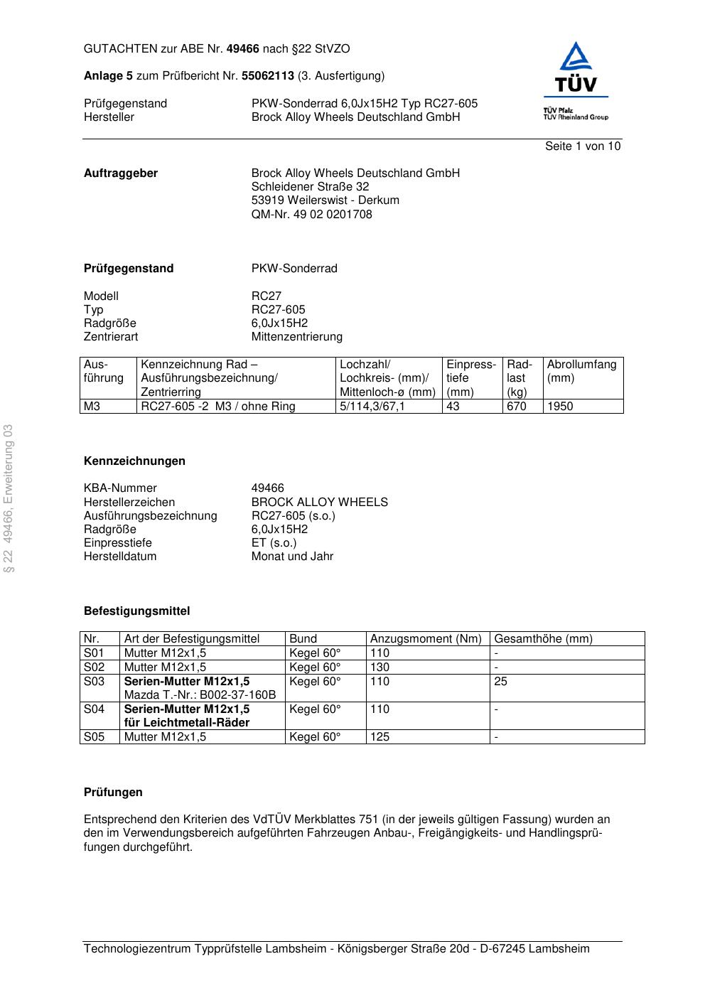 Dieses Gutachten (abe) bezieht sich auf die Alufelge Brock RC27-605 in der Ausführung 6Jx15 ET 0, Mittenloch 0 mm (KBA 49466). Im PDF findest du typischerweise zulässige Reifengrößen, Auflagen/Anbauhinweise und – je nach Dokument – Hinweise zur Eintragung.