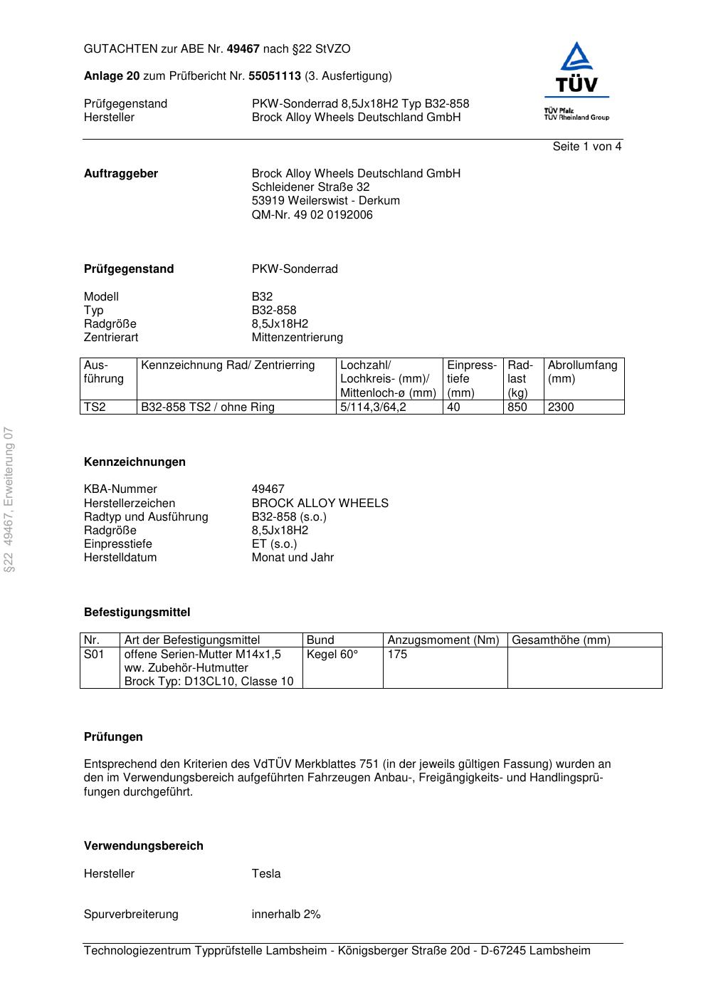 Dieses Gutachten (abe) bezieht sich auf die Alufelge Brock B32-858 in der Ausführung 8.5Jx18 ET 0, Mittenloch 0 mm (KBA 49467). Im PDF findest du typischerweise zulässige Reifengrößen, Auflagen/Anbauhinweise und – je nach Dokument – Hinweise zur Eintragung.