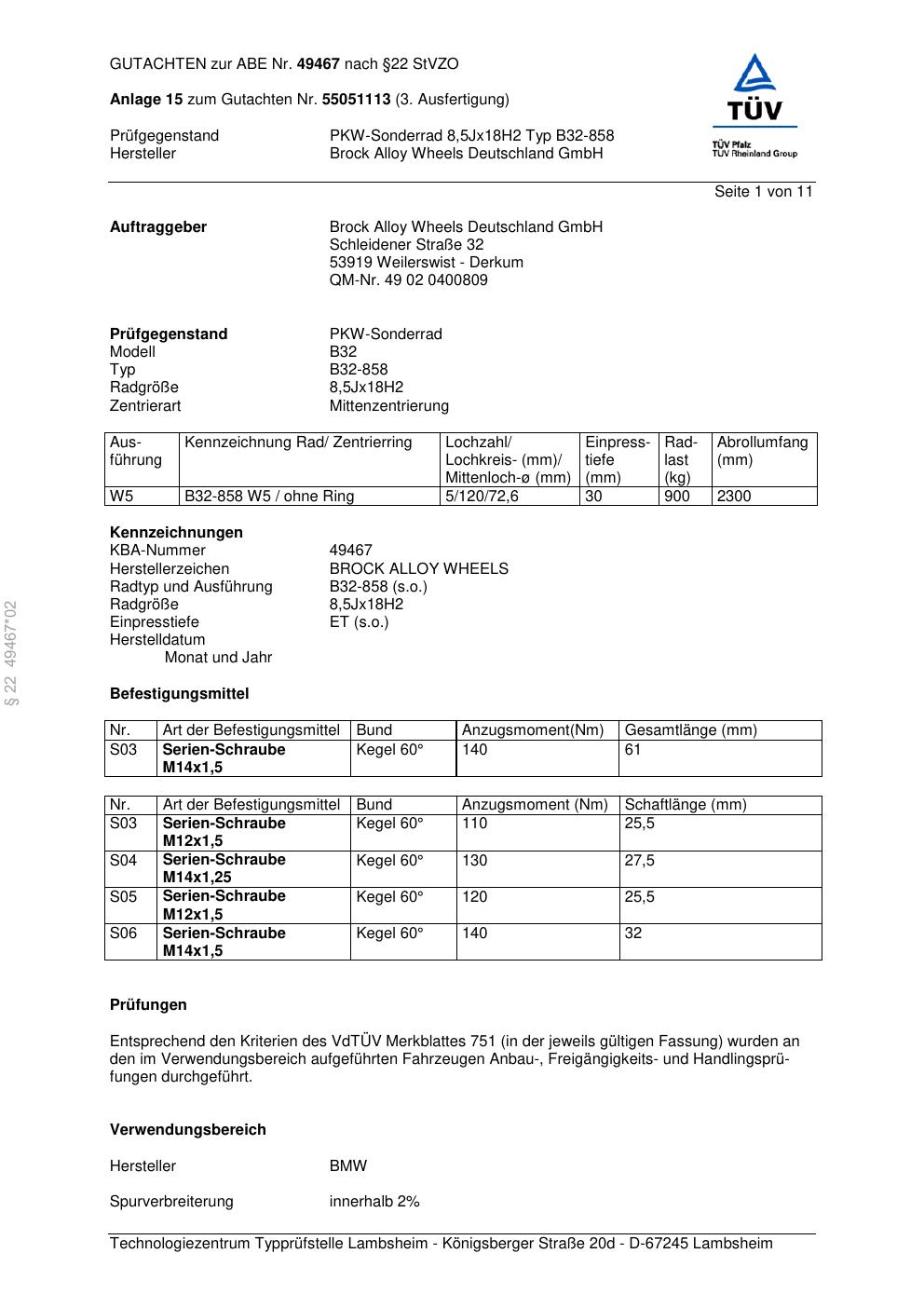 Dieses Gutachten (abe) bezieht sich auf die Alufelge Brock B32-858 in der Ausführung 8.5Jx18 ET 0, Mittenloch 0 mm (KBA 49467). Im PDF findest du typischerweise zulässige Reifengrößen, Auflagen/Anbauhinweise und – je nach Dokument – Hinweise zur Eintragung.