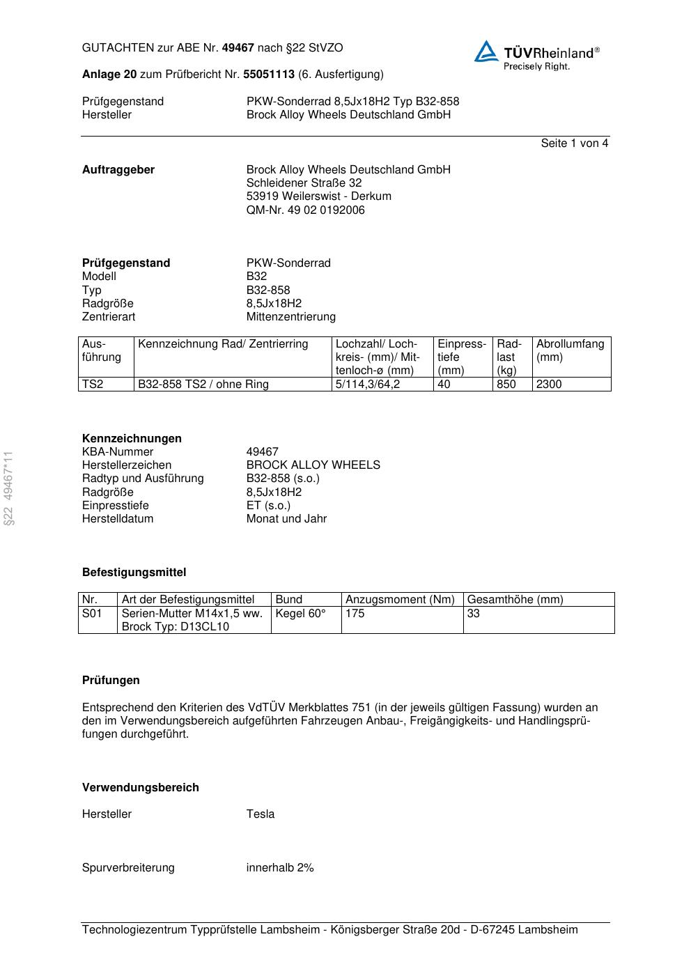Dieses Gutachten (abe) bezieht sich auf die Alufelge Brock B32-858 in der Ausführung 8.5Jx18 ET 0, Mittenloch 0 mm (KBA 49467). Im PDF findest du typischerweise zulässige Reifengrößen, Auflagen/Anbauhinweise und – je nach Dokument – Hinweise zur Eintragung.