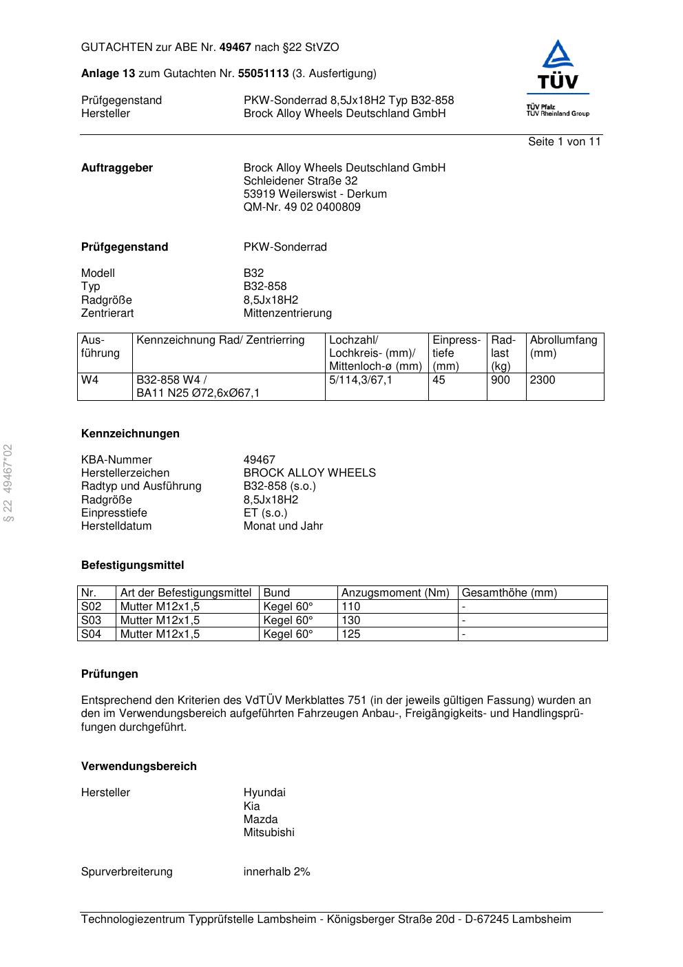 Dieses Gutachten (abe) bezieht sich auf die Alufelge Brock B32-858 in der Ausführung 8.5Jx18 ET 0, Mittenloch 0 mm (KBA 49467). Im PDF findest du typischerweise zulässige Reifengrößen, Auflagen/Anbauhinweise und – je nach Dokument – Hinweise zur Eintragung.