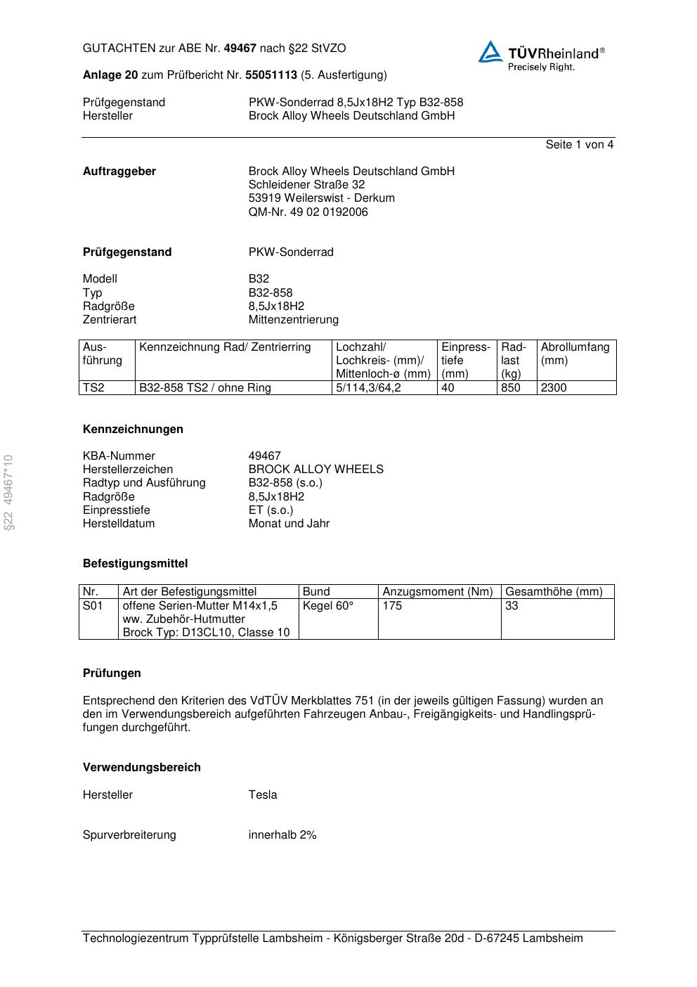Felgengutachten / abe für Alufelgen Brock B32-858 (8.5Jx18 ET 0, Mittenloch 0 mm) mit KBA 49467 (Zertifikatsnummer 49467). Hier kostenlos als PDF herunterladen. Der Download-Link ist 24 Stunden gültig und kann bis zu zwei Mal verwendet werden.