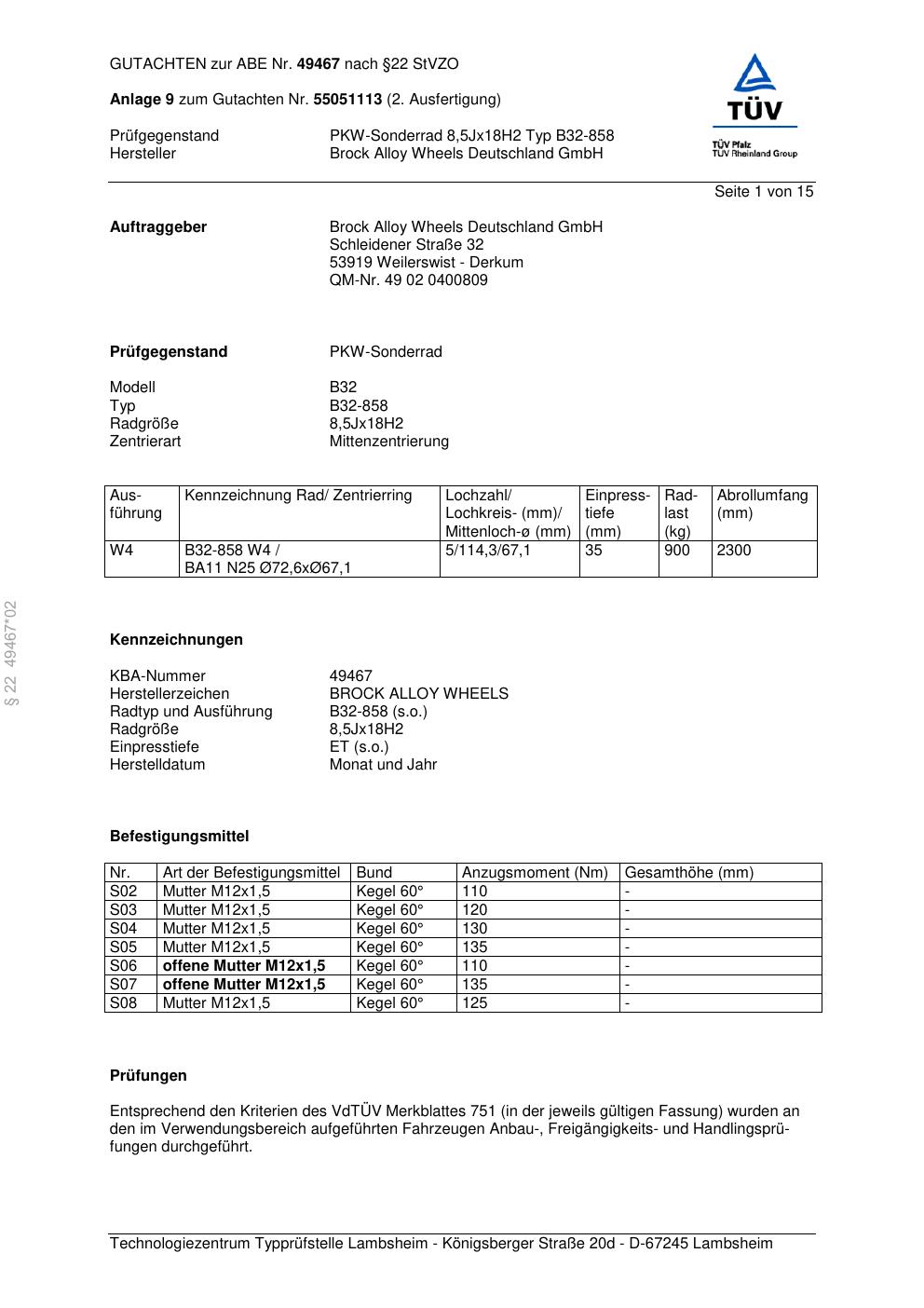 Dieses Gutachten (abe) bezieht sich auf die Alufelge Brock B32-858 in der Ausführung 8.5Jx18 ET 0, Mittenloch 0 mm (KBA 49467). Im PDF findest du typischerweise zulässige Reifengrößen, Auflagen/Anbauhinweise und – je nach Dokument – Hinweise zur Eintragung.