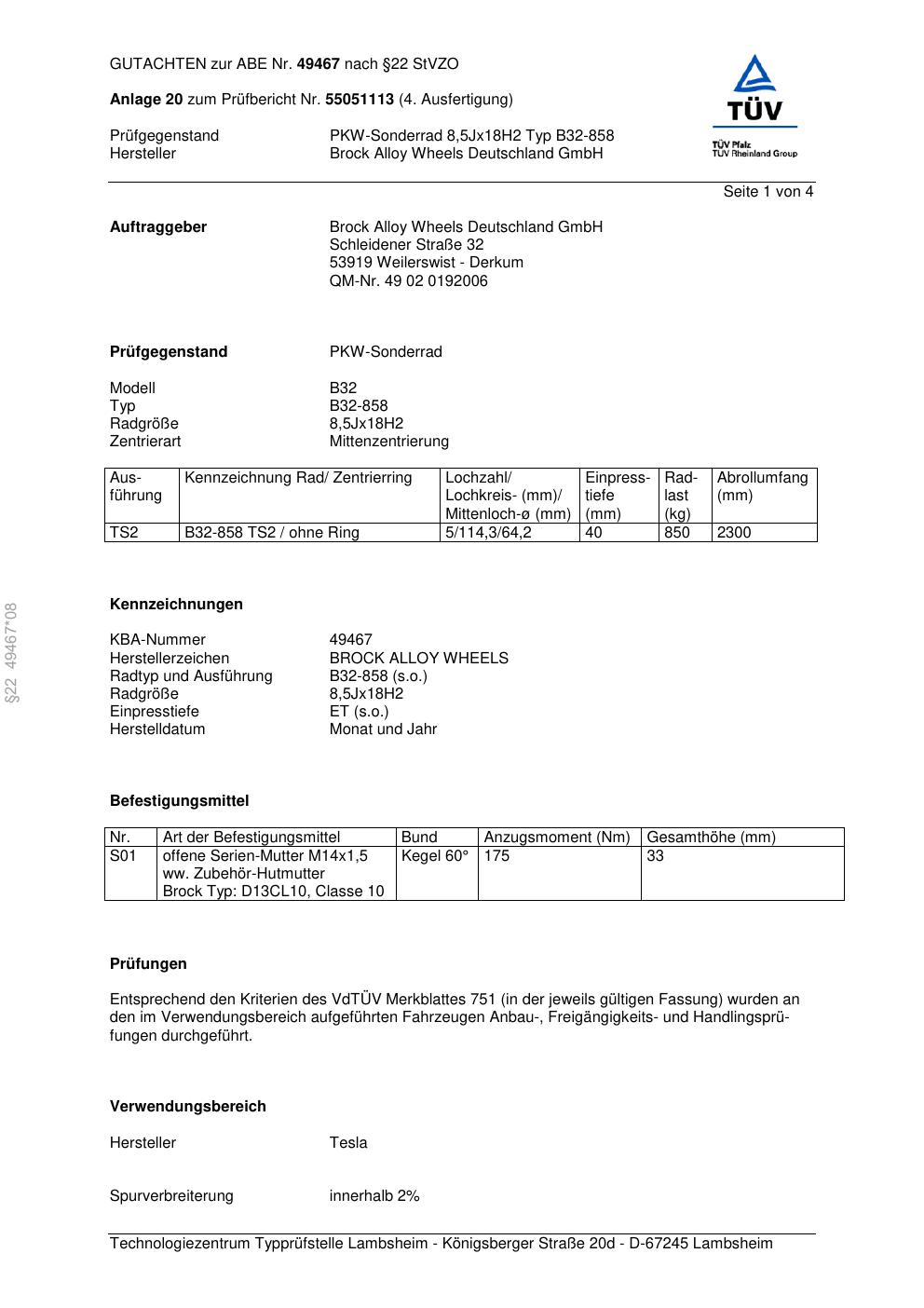Dieses Gutachten (abe) bezieht sich auf die Alufelge Brock B32-858 in der Ausführung 8.5Jx18 ET 0, Mittenloch 0 mm (KBA 49467). Im PDF findest du typischerweise zulässige Reifengrößen, Auflagen/Anbauhinweise und – je nach Dokument – Hinweise zur Eintragung.