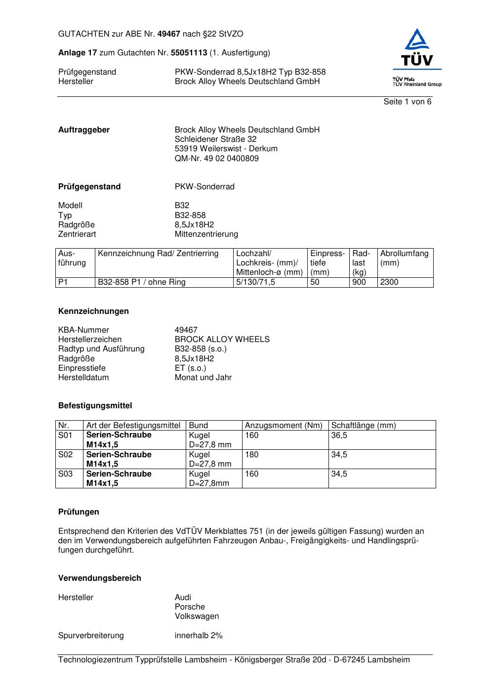 Dieses Gutachten (abe) bezieht sich auf die Alufelge Brock B32-858 in der Ausführung 8.5Jx18 ET 0, Mittenloch 0 mm (KBA 49467). Im PDF findest du typischerweise zulässige Reifengrößen, Auflagen/Anbauhinweise und – je nach Dokument – Hinweise zur Eintragung.