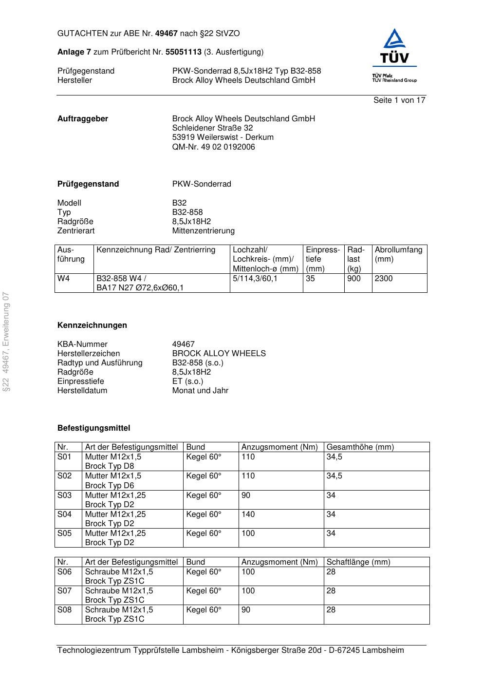 Dieses Gutachten (abe) bezieht sich auf die Alufelge Brock B32-858 in der Ausführung 8.5Jx18 ET 0, Mittenloch 0 mm (KBA 49467). Im PDF findest du typischerweise zulässige Reifengrößen, Auflagen/Anbauhinweise und – je nach Dokument – Hinweise zur Eintragung.