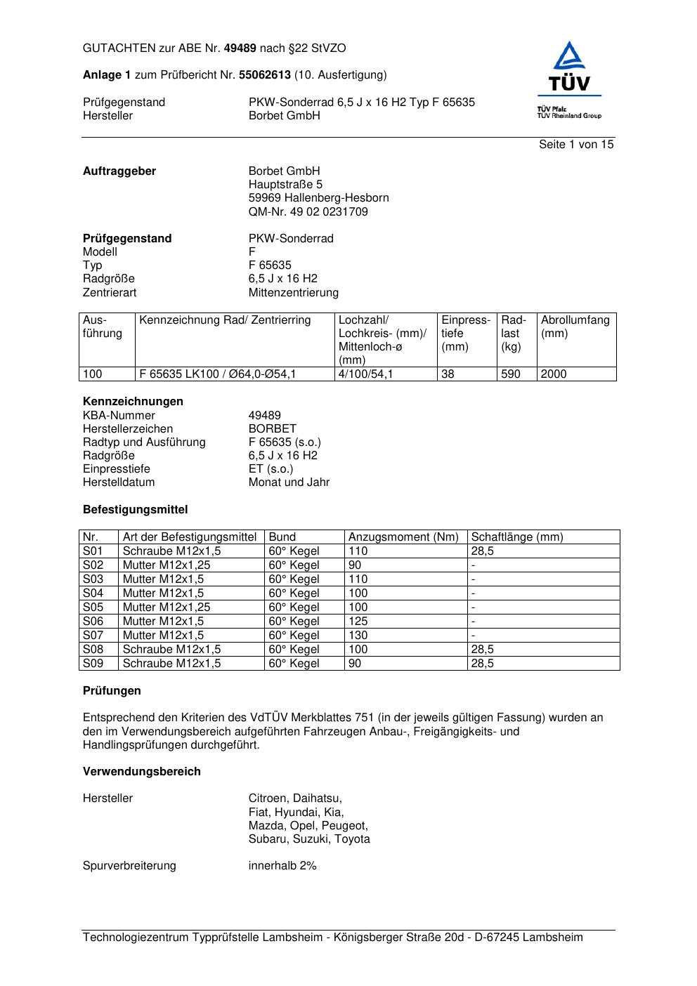 Dieses Gutachten (abe) bezieht sich auf die Alufelge Borbet F 65 635 in der Ausführung 6.5Jx16 ET 0, Mittenloch 0 mm (KBA 49489). Im PDF findest du typischerweise zulässige Reifengrößen, Auflagen/Anbauhinweise und – je nach Dokument – Hinweise zur Eintragung.