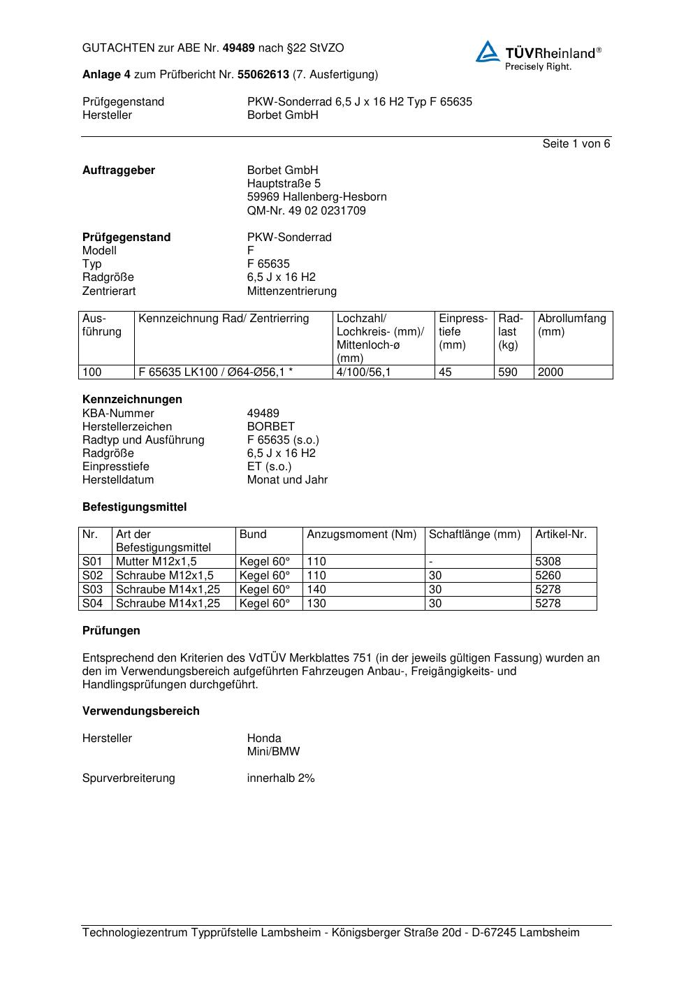 Dieses Gutachten (abe) bezieht sich auf die Alufelge Borbet F 65 635 in der Ausführung 6.5Jx16 ET 0, Mittenloch 0 mm (KBA 49489). Im PDF findest du typischerweise zulässige Reifengrößen, Auflagen/Anbauhinweise und – je nach Dokument – Hinweise zur Eintragung.