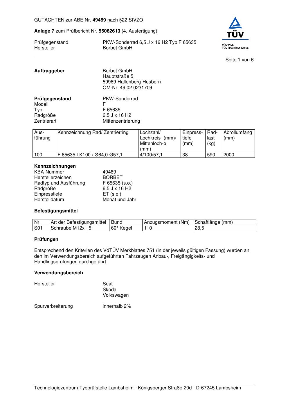 Dieses Gutachten (abe) bezieht sich auf die Alufelge Borbet F 65 635 in der Ausführung 6.5Jx16 ET 0, Mittenloch 0 mm (KBA 49489). Im PDF findest du typischerweise zulässige Reifengrößen, Auflagen/Anbauhinweise und – je nach Dokument – Hinweise zur Eintragung.